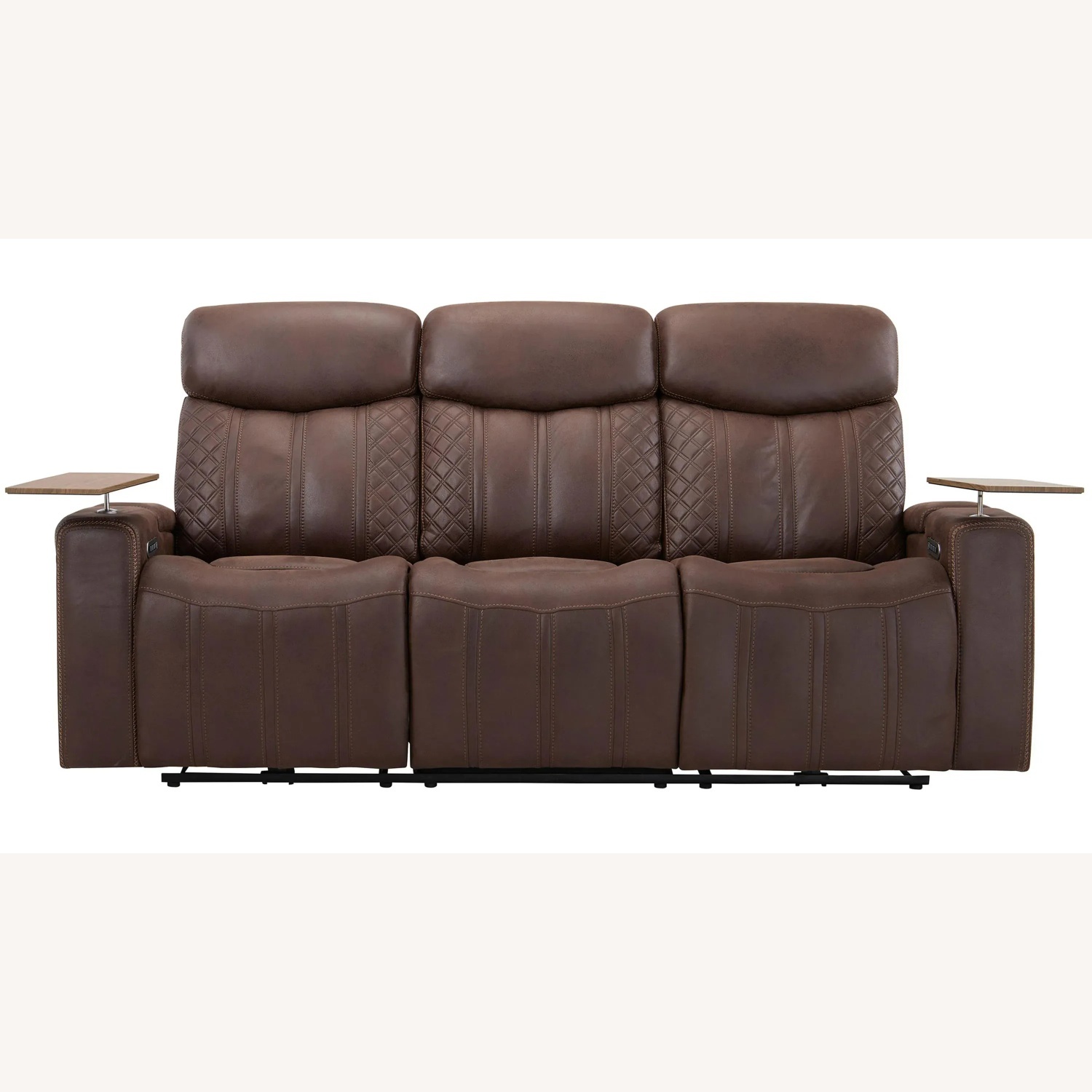 Let the rugged luxury and modern comfort of the Royce 2-pc. triple power living room set transform your favorite seating area. Featuring rich brown faux leather accented with unique rustic-style stitching, the sofa and loveseat deliver a warm, handcrafted look that really stands out. Complementary to its timeless charm, the Royce collection is loaded with power motion options, USB and wireless charging, plus a drop down sofa table and loveseat console with cupholders and hidden storage. Check out the removable swing tables for another special feature!