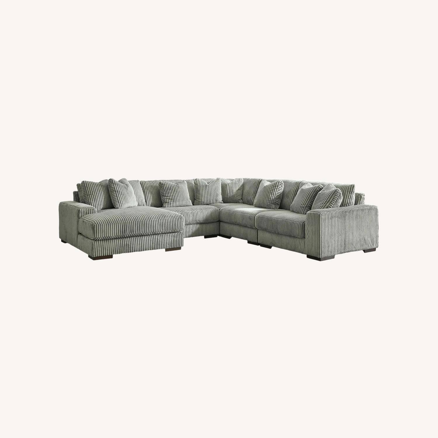 Lindyn 5-pc. Sectional with Chaise stunningly soft fabric entices in a warm neutral hue, complementing contemporary color palettes. Sink into the cushions and plan to stay a while-this cozy living room centerpiece highlights your high-end approach to comfort and style. All Dimensions Color: Fog Care Instructions Pattern: Solid Brand: Ashley Construction Style & Types