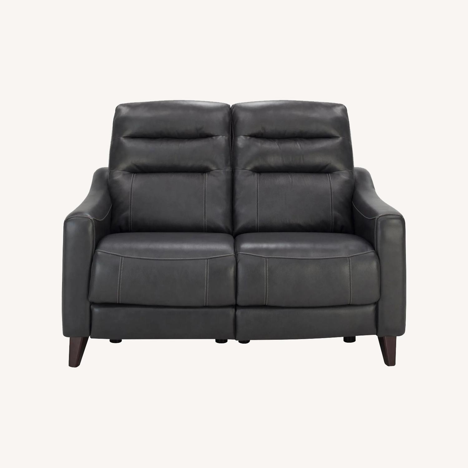 Experience comfort at the push of a button with the sleek leather Graham Power Loveseat w/ Power Headrest. Upholstered in rich, supple leather, it combines contemporary design with ergonomic luxury. Power reclining and headrests help you find your perfect lounging position, while the plush channel-tufted backrests and supportive armrests cradle you in style. Tapered wood legs add a touch of sophistication, making this loveseat a standout piece for any modern living space.