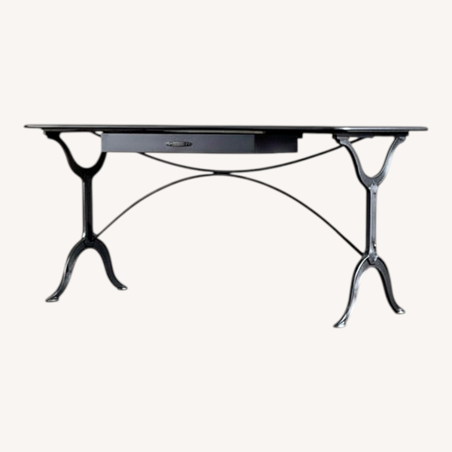 Seller's Notes:A faithful reproduction of a 1950s English garment factory table, our desk offers the juxtaposition of workhorse practicality and elegantly graceful lines. Evoking the best of vintage industrial design, the smoothly rounded corners are anchored by cast arched trestle legs. An expansive top and center drawer offer ample work space and storage.