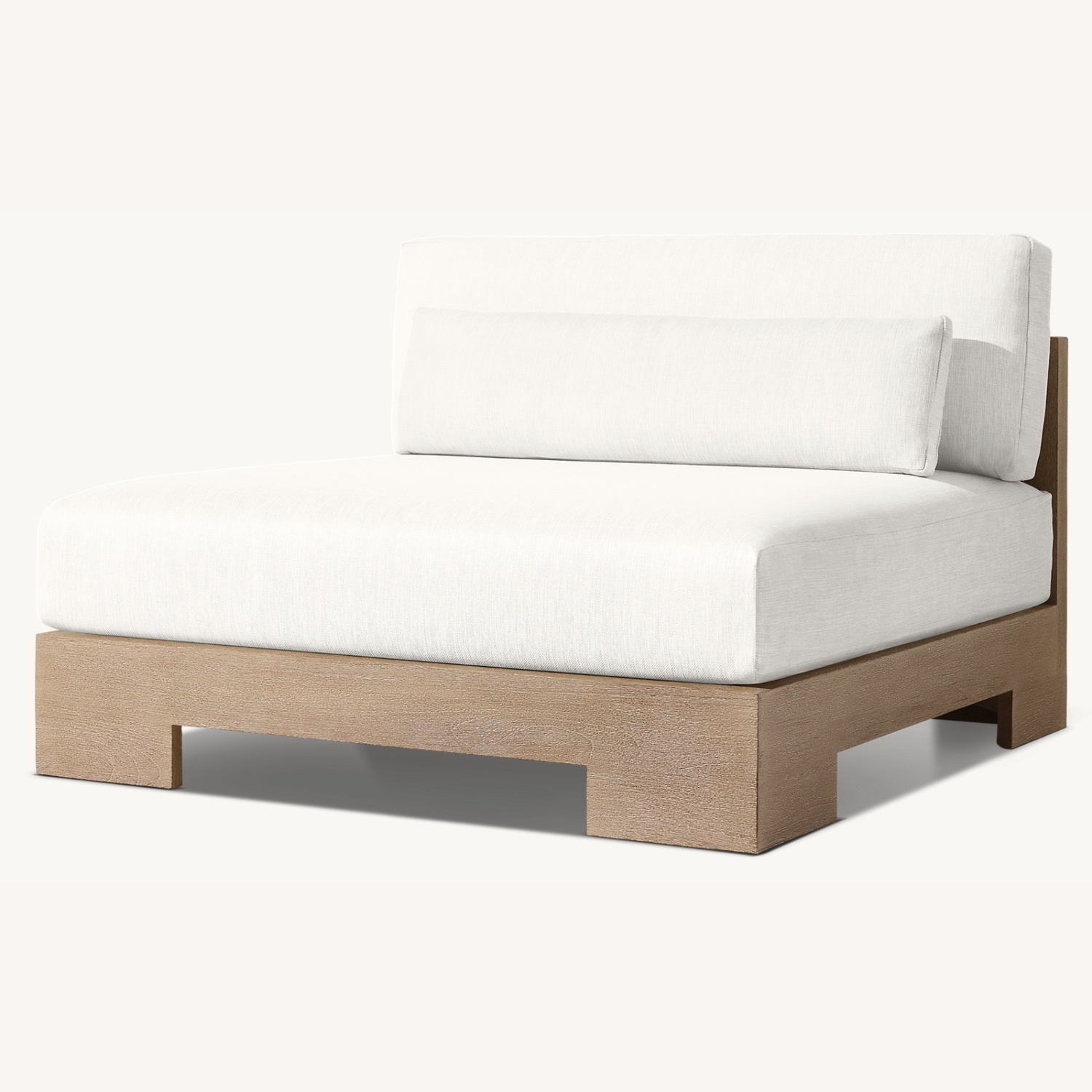 Seller's Notes:Restoration Hardware Outdoor Belvedere armless loveseat. Weathered teak brown wood. White Brushed linen cushions . Excellent Condition.