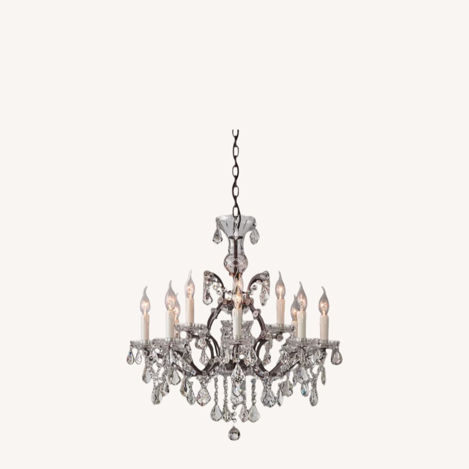 Seller's Notes:RH 19th C. Rococo Iron & Crystal Round Chandelier Designed by Timothy Oulton 28" Diameter | Iron & Crystal New in Box Select images may be digitally staged for inspiration. ──────────── VICTORIAN OPULENCE, SCULPTURAL SPARKLE Inspired by the grandeur of Victorian English lighting, the 19th C. Rococo Iron & Crystal Chandelier by Timothy Oulton pairs rustic metalwork with an extraordinary display of light-refracting crystal. A curved iron framework supports cascading strands of precision-cut glass crystals, creating layers of shimmer and movement. Candlestick-style sockets rise elegantly from the frame, echoing the romantic silhouette of historic European chandeliers while maintaining a balanced, sculptural presence. When illuminated, the hundreds of crystals refract light beautifully throughout the space, producing a dramatic yet refined glow that transforms the room beneath it. ──────────── MATERIALS & CONSTRUCTION • Rustic iron frame with sculptural curved arms • Strung with hundreds of precision-cut glass crystals • Crystal drops suspended beneath the metal arms • Candlestick-style E12 sockets for traditional chandelier silhouette • Precision-polished crystals designed for optimal light refraction The chandelier combines the rugged texture of metal with the brilliance of crystal, creating a striking contrast between industrial structure and refined sparkle. ──────────── LIGHTING DETAILS • Rated for twelve 25W max. E12 candelabra bulbs • Bulbs included • Compatible with dimmer switches • Hardwired fixture If brighter illumination is desired, higher-lumen LED candelabra bulbs may be used. ──────────── DIMENSIONS Chandelier Body: • 27½" Diameter x 28½"H Minimum Installed Height: • 38¾" Maximum Installed Height: • 109¾" Canopy: • 4¾" Diameter x 3¼"H Chain: • 6' L Cord: • 12' L Weight: • 20 lbs. Chain length can be adjusted at the time of professional installation. ──────────── STYLE OVERVIEW The 19th C. Rococo chandelier blends historic European elegance with industrial character. Its ornate crystal structure reflects traditional Rococo lighting, while the darker iron frame introduces a grounded, slightly rustic element. This balance allows the chandelier to function beautifully in both classic and contemporary interiors, including: • Traditional and historic homes • Modern farmhouse interiors • Transitional dining rooms • European-inspired spaces • Eclectic or layered design schemes At 28 inches in diameter, it offers dramatic visual presence while remaining appropriately scaled for dining rooms, bedrooms, entryways, or living spaces. ──────────── CRYSTAL & FINISH OVERVIEW The chandelier features hundreds of precision-cut glass crystals designed to maximize light refraction and sparkle. Each crystal strand catches and reflects light from multiple angles, producing a layered glow that adds depth and atmosphere to the room. The rustic iron frame provides contrast to the brilliance of the crystals, grounding the design and preventing the piece from feeling overly formal or ornate. Together, the materials create a sophisticated balance between texture, light, and architectural structure. ──────────── CONDITION | NEW IN BOX This chandelier is new in box and has not been installed. The fixture remains in its original packaging and includes the chandelier components, chain, and bulbs as provided by Restoration Hardware. Professional assembly and installation by a licensed electrician are recommended due to the complexity of crystal chandeliers. ──────────── RETAIL VALUE Configured Price • RH Sale: $2,669 • RH Regular: $3,140 ──────────── WHY THIS PIECE STANDS OUT • Authentic RH lighting design by Timothy Oulton • Inspired by historic 19th-century Rococo chandeliers • Hundreds of precision-cut glass crystals • Dramatic 12-light configuration • Rustic iron frame with sculptural arms • New in original packaging • Significant savings compared to RH retail pricing ──────────── #RHLighting #RestorationHardware #TimothyOulton #CrystalChandelier #LuxuryLighting #DesignerLighting #CuratedHome