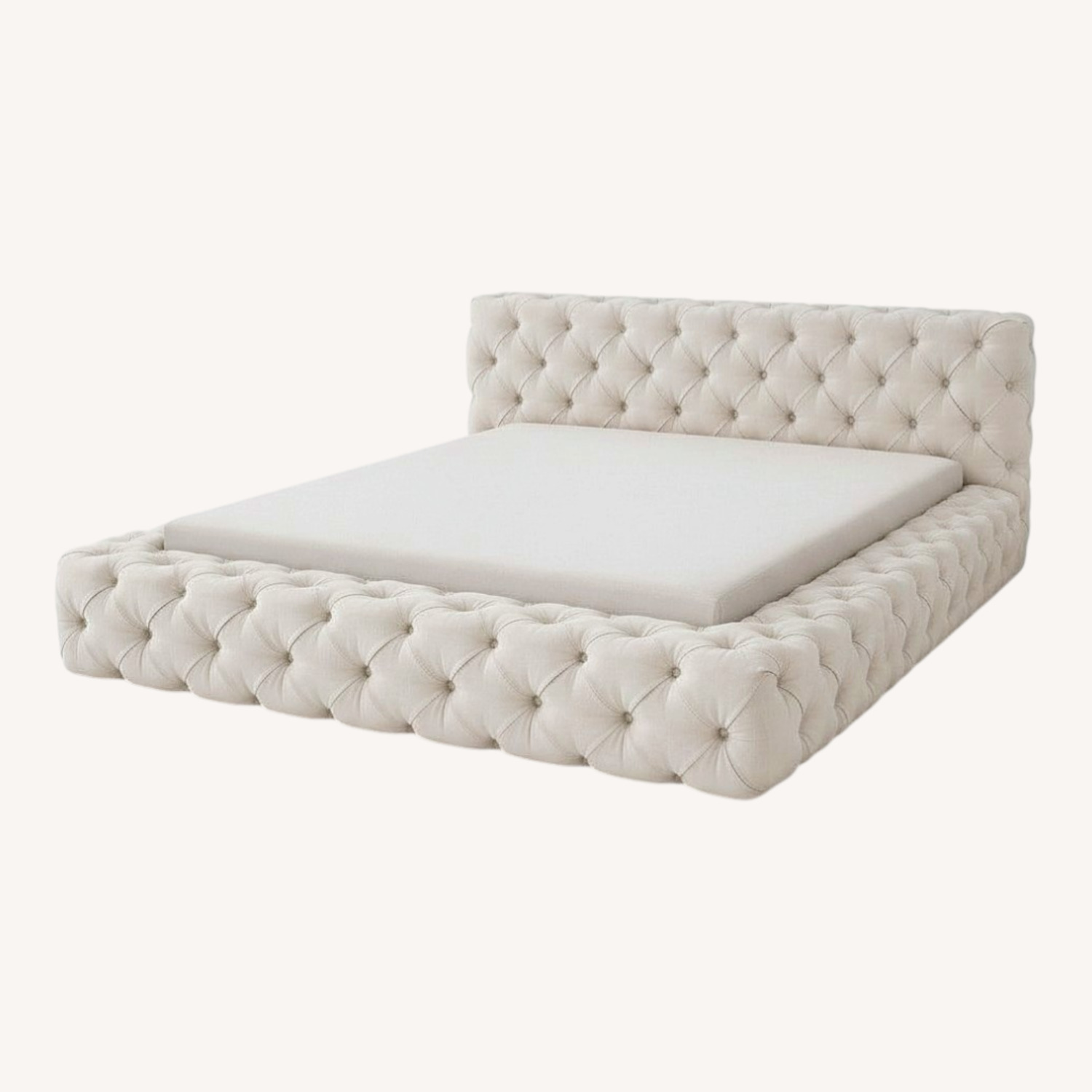 Seller's Notes:With its plushly padded headboard and wide wraparound rail, our grandly proportioned Soho bed is comfort writ large. Its allover button tufting recalls classic Chesterfield furniture – plush seating for London's turn-of-the-century gentlemen's clubs – but its clean lines and rakishly low profile imbue it with contemporary, of-the-moment style.