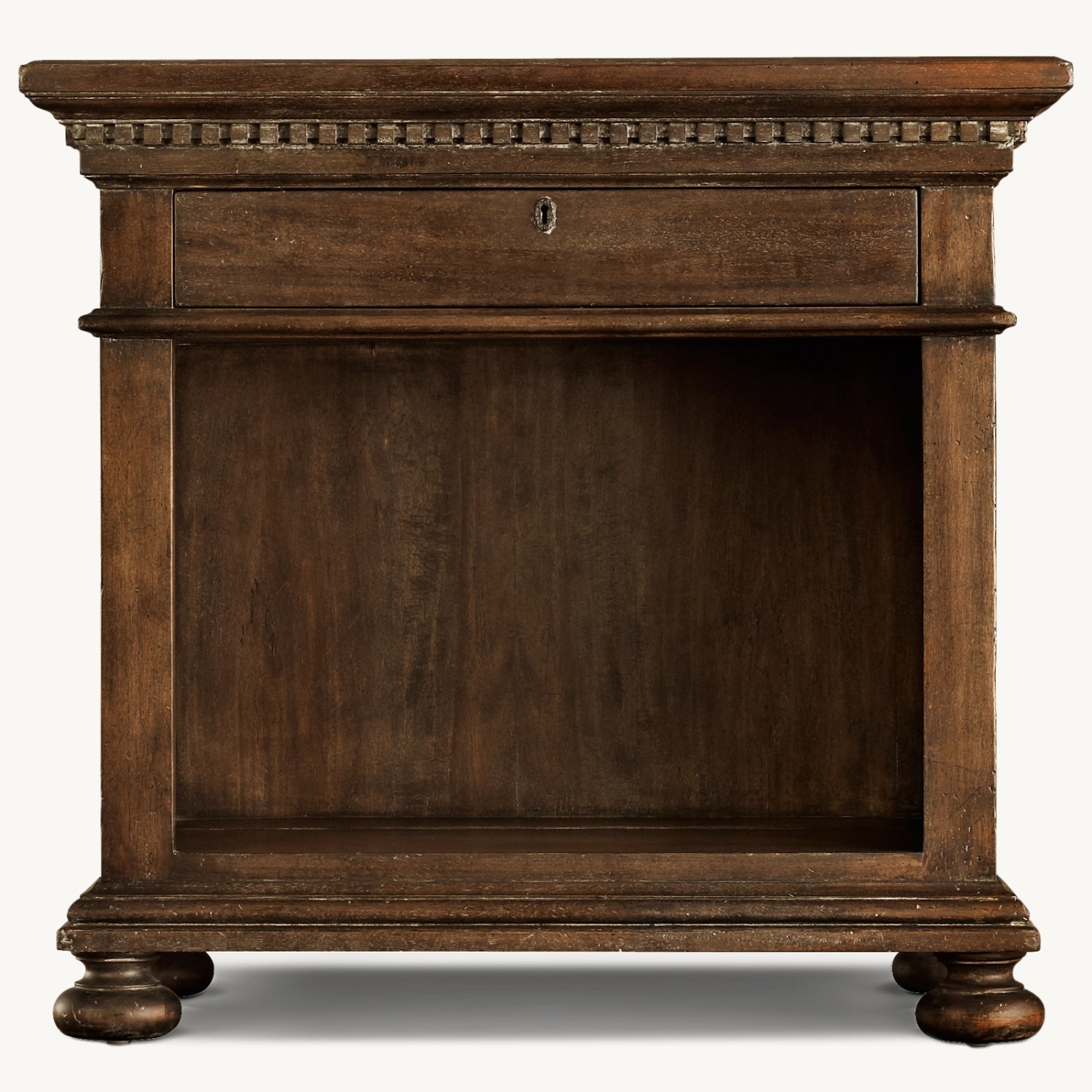 Seller's Notes:Restoration Hardware St James Open Night Stand in Antiqued Coffee color. Evoking the architectural classicism of turn-of-the-century design, from designer Geoffrey Hawkes is grand in both scale and beauty. Distinguished by hand-carved fluted cornices, corbels and dentil detailing, the timeless collection is expertly constructed of hardwood with enduring mortise-and-tenon joinery.