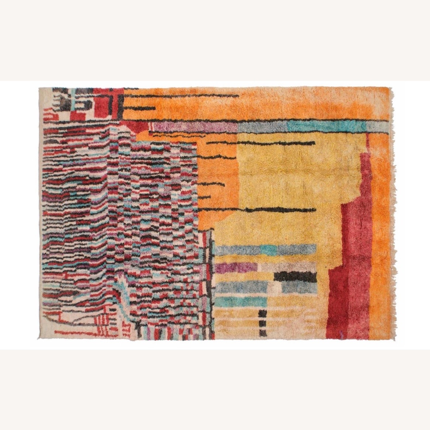 Seller's Notes:One-of-a-kind rug, hand-knotted near the small city of Boujad in the Chaouia-Ouardigha region of Morocco. 100% wool Dimensions: 9'3" x 13'1" (283 cm x 398 cm) Plush pile: approximately 1.2" (3 cm) Color palette: tangerine orange, mustard yellow, inky black, cadmium red, pale sage gray