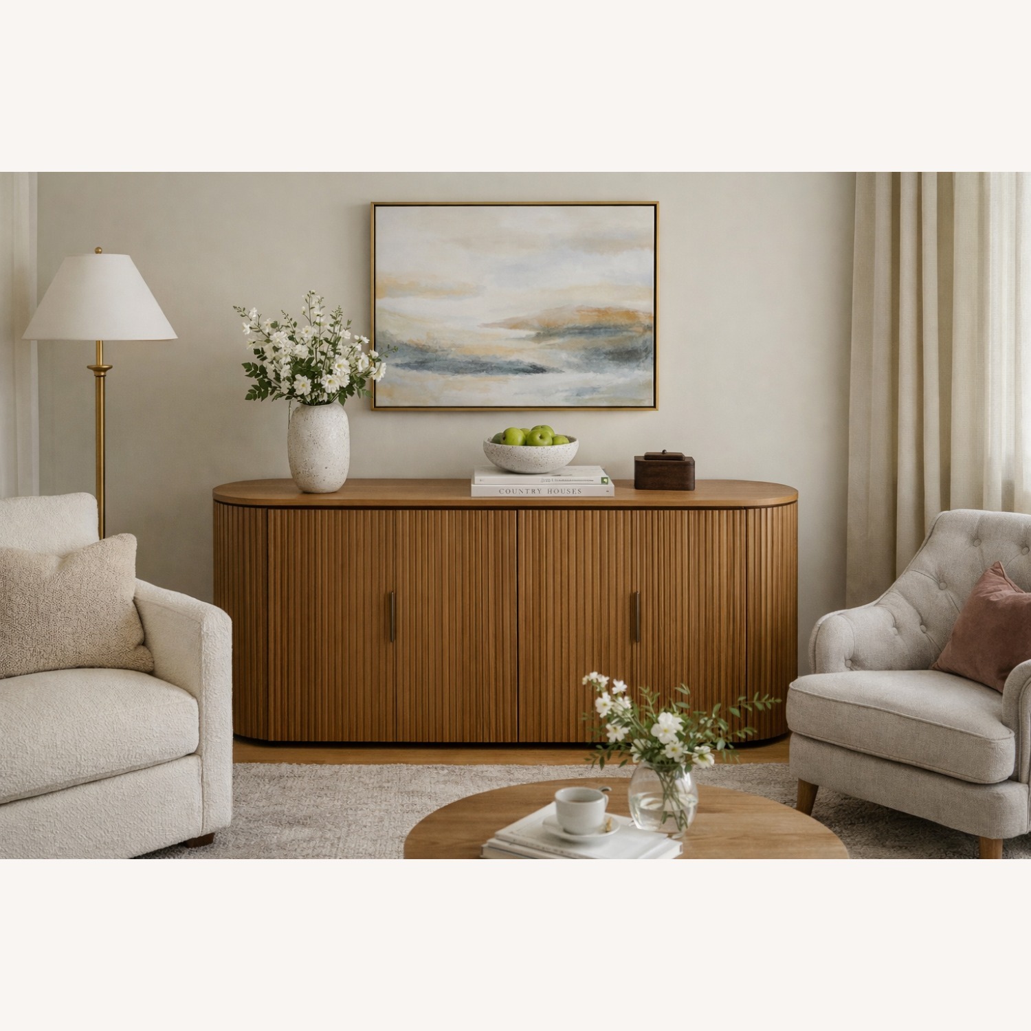 Seller's Notes:RH Byron 84" Sideboard Natural Oak Designed by Harrison & Nicholas Condos Open Box | Excellent Condition Select images may be digitally staged for scale and inspiration. ──────────── THE BYRON COLLECTION Designed by Australian visionaries Harrison Condos and Nicholas Condos, the Restoration Hardware Byron Collection is defined by sculptural curves and dramatic vertical reeding. The contemporary silhouette appears fluid in nature, resting atop a recessed plinth base that gives the substantial 84-inch form a floating architectural presence. In this Natural Oak finish, the piece leans warmer and more organic, allowing the craftsmanship and grain character to take center stage. ──────────── MATERIALS & CONSTRUCTION • Handcrafted of solid American white oak reeding and veneers • Engineered hardwood core for structural integrity • Finish achieved through an intensive multistep process • Oak is wire-brushed by hand to highlight natural grain • Doors accented with vertical reeding • Solid stainless steel hardware • Recessed plinth base • Back and interior finished in a complementary tone • 2 adjustable shelves (1 per side) • 2 rear cord cutouts for wire management As a handcrafted piece, variations in grain, tone, and texture are inherent and celebrated. Each sideboard is unique. ──────────── DIMENSIONS Overall: • 84"W x 20"D x 32"H Cabinet Interior (2): • 15"W x 18"D x 29¾"H Shelves (2): • 29½"W x 18¼"D x 1¼"H Weight: 178 lbs. ──────────── COLOR & FINISH OVERVIEW The Natural Oak finish presents as a warm, neutral oak tone with visible grain movement throughout. The hand wire-brushed surface enhances depth and texture, allowing the natural variation of the wood to remain part of the visual story. Light interacts beautifully with the vertical reeding, creating subtle shadowing and tonal variation across the curved façade. The result is organic, layered, and quietly architectural. ──────────── BYRON COLLECTION CHARACTERISTICS The Byron Collection is intentionally artisan crafted. Due to the nature of solid oak reeding and the hand-finishing process, natural characteristics such as slight reeding separation, subtle wood checking, minor surface movement, or small hairline cracks can occur over time. These are not structural flaws. They are inherent to solid wood construction and are widely recognized as part of the collection’s organic, sculptural aesthetic. Byron is designed to feel architectural and natural — not machine-perfect. ──────────── CONDITION | OPEN BOX, BEAUTIFUL PRESENTATION This sideboard is offered in excellent open box condition and presents beautifully. The reeded oak finish is clean, doors align properly, and the interior shelving is intact and functional. As with any open box piece that has been handled, transported, or stored, minor signs of handling may be present upon close inspection. Nothing is notable or detracts from the overall presentation. ──────────── RETAIL VALUE Configured Price: • RH Member: $2,995 • RH Regular: $4,280 ──────────── WHY THIS PIECE STANDS OUT • Authentic RH Byron design • Designed by Harrison & Nicholas Condos • Sculptural curved silhouette • Dramatic vertical reeded oak detailing • Warm Natural Oak finish • Fully finished back • 84" statement scale • Significant value compared to retail ──────────── #RHByron #RestorationHardware #NaturalOak #LuxuryStorage #DesignerFurniture #ModernSideboard #ArchitecturalDesign