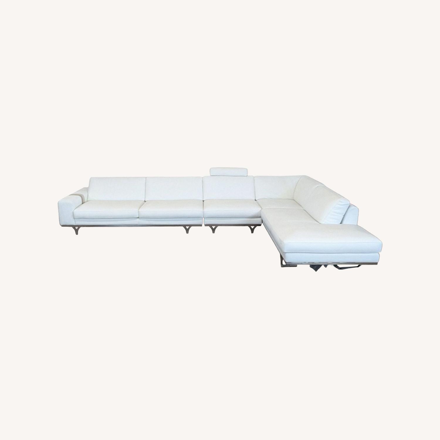 Seller's Notes:This Roche Bobois designer sectional sofa offers a clean and modern look with its white Italian leather upholstery and sleek metal legs. It features spacious seating with a comfortable chaise lounge, perfect for relaxing or entertaining. The sofa includes an adjustable headrest for added comfort. Ideal for any contemporary living room. Excellent condition.