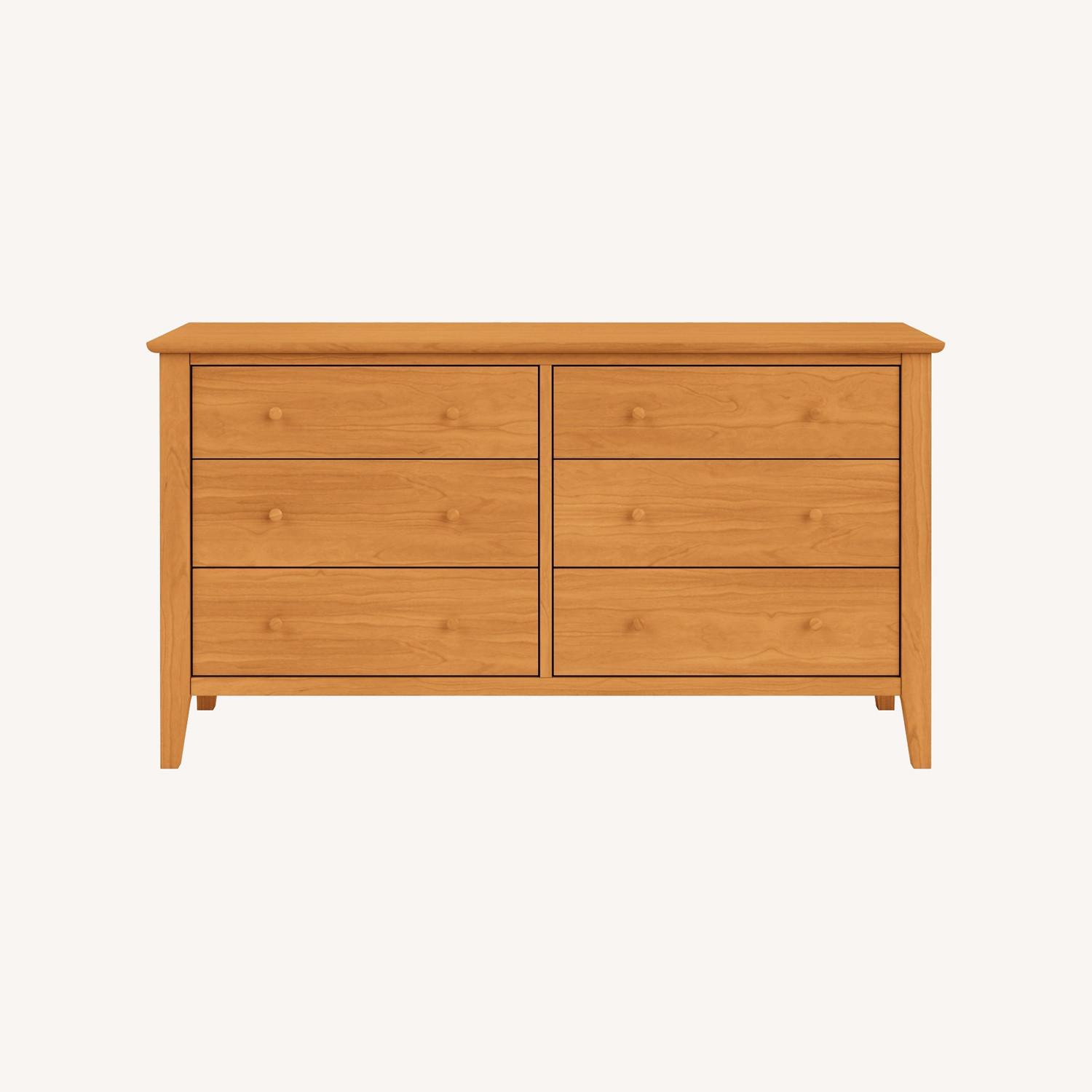 Seller's Notes:This cherry wood, Room & Board, Danbury collection dresser with wrought iron drawer pulls (along with the matching armoire also listed on this site) has been with me for many years and yet it still looks new! The quality and craftsmanship are outstanding, and the drawer storage space is ample. I would not be parting with this item if I was not making a major move abroad for work. There are some minor scratches on the corner from my cat, but these are relatively unnoticeable unless you are really looking for them. The drawers pull out far, giving you plenty of access, and have wooden drawer stops so you don't pull them out too far. This is a classic piece that will give a new owner decades of enjoyment!