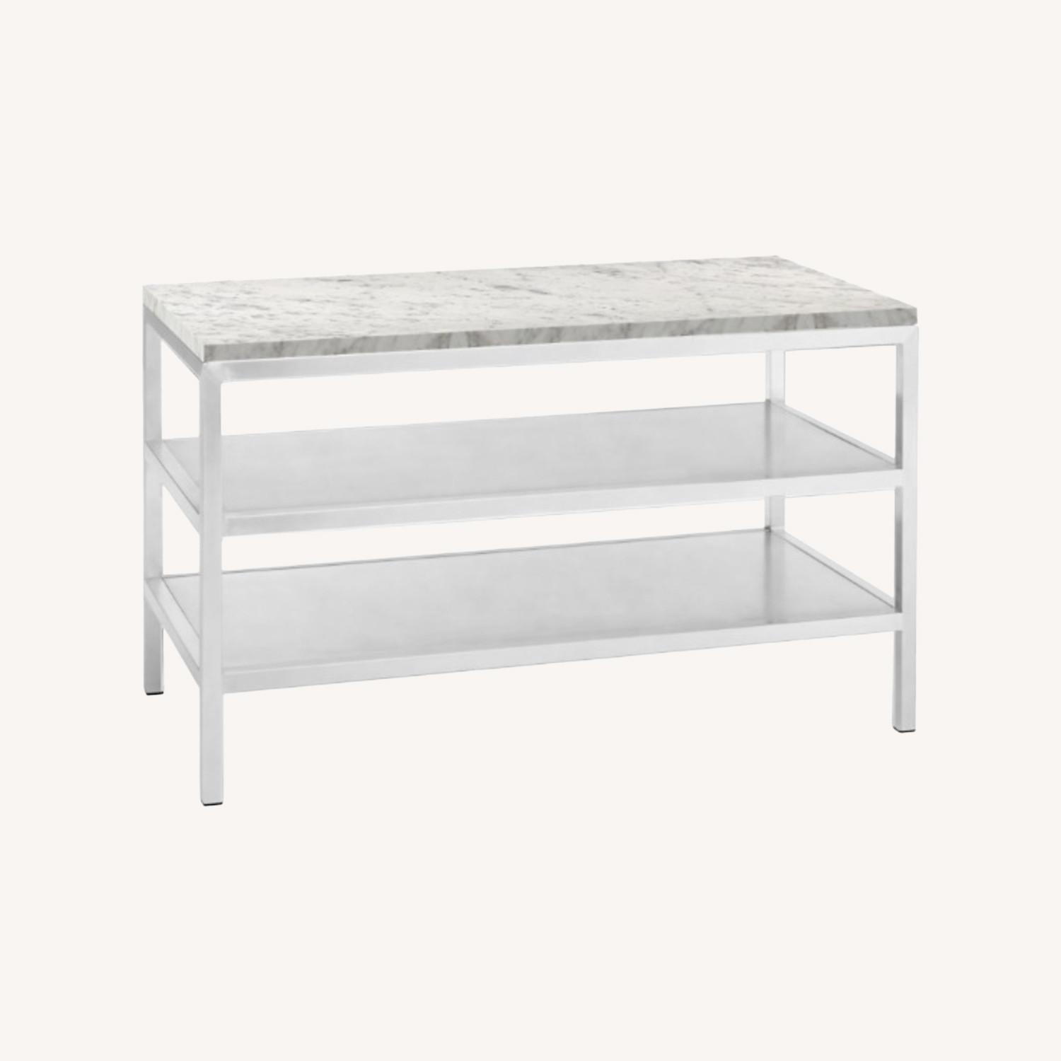 Seller's Notes:Amazing beautiful and very solid piece of furniture. Venatino marble top. Stainless steel shelves and legs. Each steel base is welded in Wisconsin.
