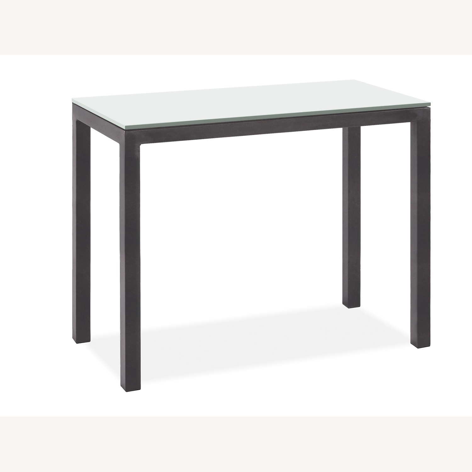 Seller's Notes:Parsons desk with white glass top and 2" wide graphite legs. In great shape. Room and Board selling new for $610. Also selling Container Store black Bungee office chair.
