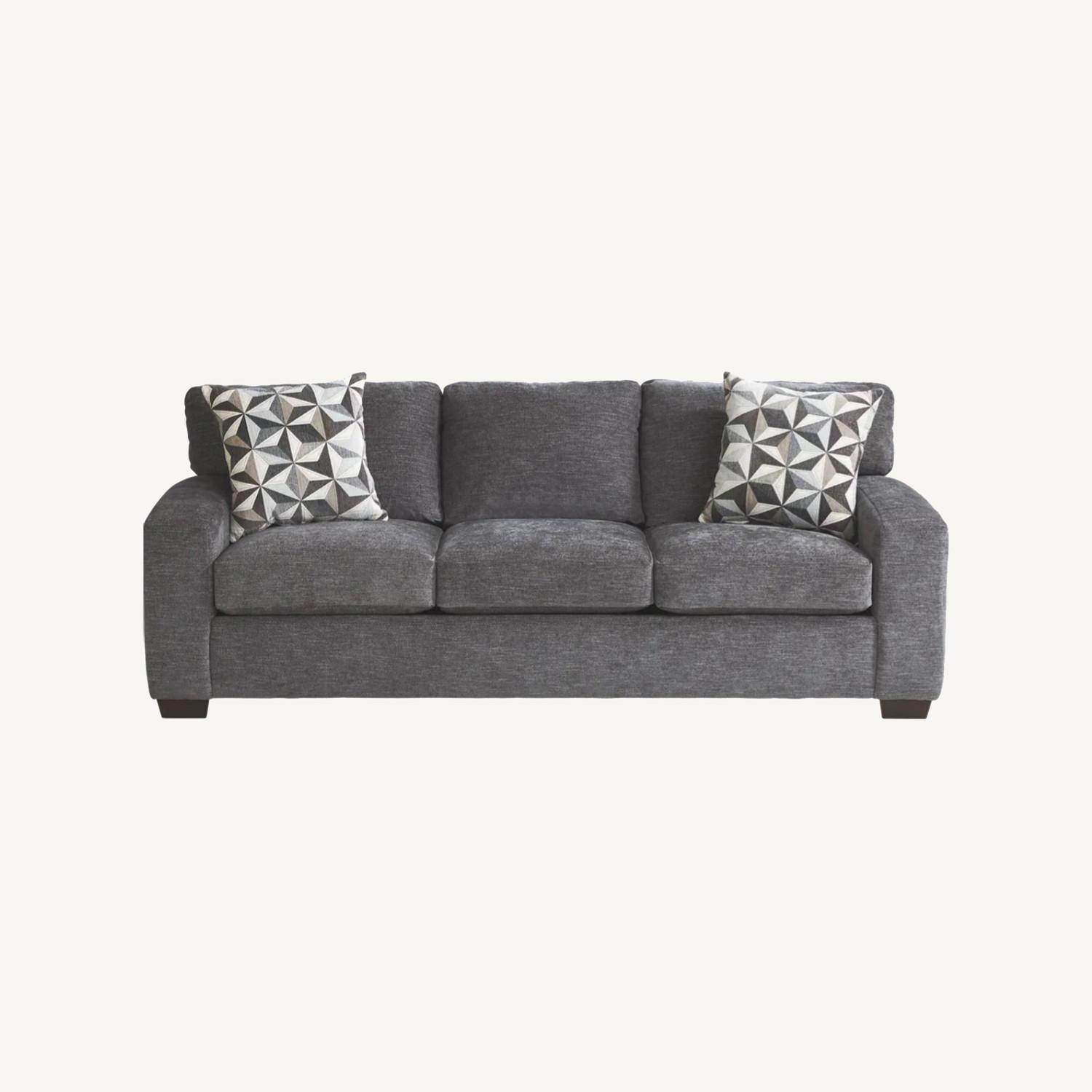 Combining modern allure with transitional style, the Finley Point sofa pairs comfort with classic appeal. Upholstered in polyester fabric, this sofa boasts a neutral granite color that complements any decorative palette. Loose seat cushions provide reversible usage and long-lasting style as plush back cushions offer soft support. Curved track arms and jacquard accent pillows add a look of understated elegance. Upholstery: 100% Polyester