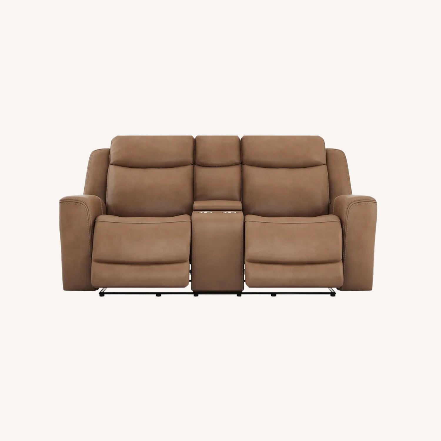 Sleek lines, luxurious comfort, and casual artistry meld into the space-defining appeal of the Drew & Jonathan Davidson loveseat. A transitional spin on a family favorite, this piece is upholstered in caramel top grain leather where the body touches. Top-stitched seams stand out on every curve and exaggerated slope, while tight, angular structural details on the arms and back maintain a strong outline when viewed from anywhere in the room. The track arms roll inward to deep, curved seats that cradle guests in luxurious comfort. Dual power reclining takes relaxation to the next level and includes adjustable headrests and footrests, with USB power on the control panel for easy charging and custom comfort. This loveseat also features a convenient center console with cupholders and hidden storage. Upholstery: Top grain leather where the body touches and polyurethane sides and backs.