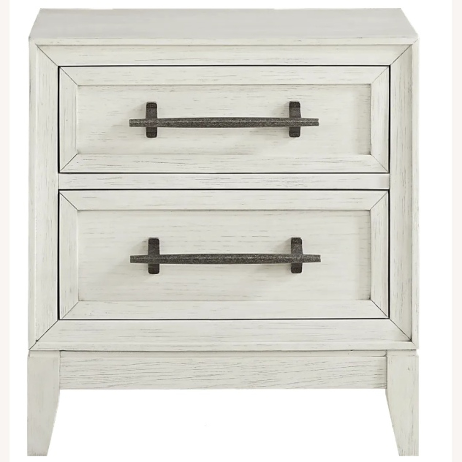 Seller's Notes:The River Falls nightstand offers beautiful bedside storage with clean lines and double drawers. Each drawer is made with English dovetail joints for stability and strength while weathered pewter finished hardware adds a practical enhancement. Crafted with oak veneers, the nightstand boasts an eye-catching white finish. The bottom drawer is dust proofed to protect stored items from up drafting dust.