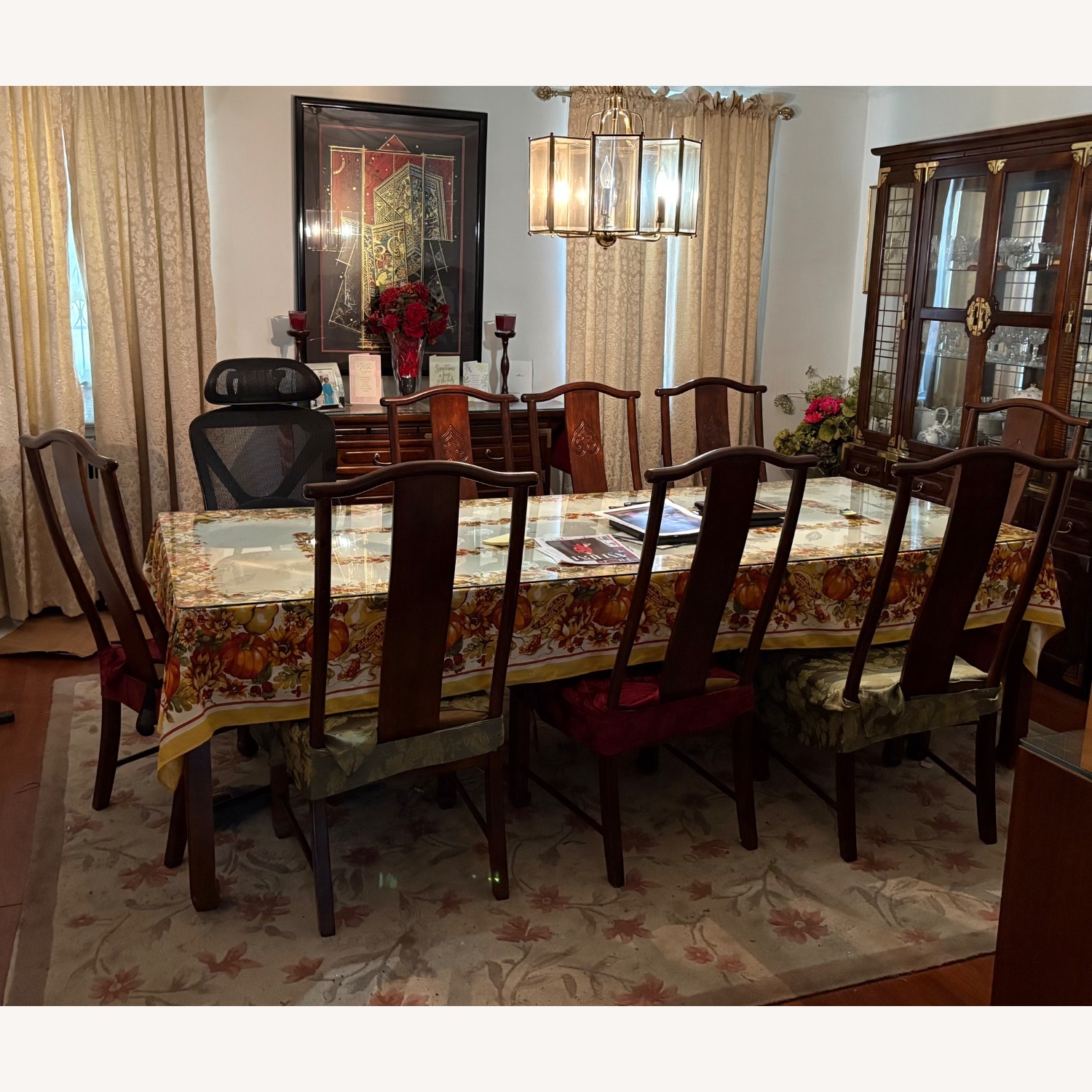 Seller's Notes:vintage Oriental style Chinese rosewood expandable dining set with a glass top and eight chairs. The set features a traditional hand-carved design and a hand-rubbed lacquer finish.