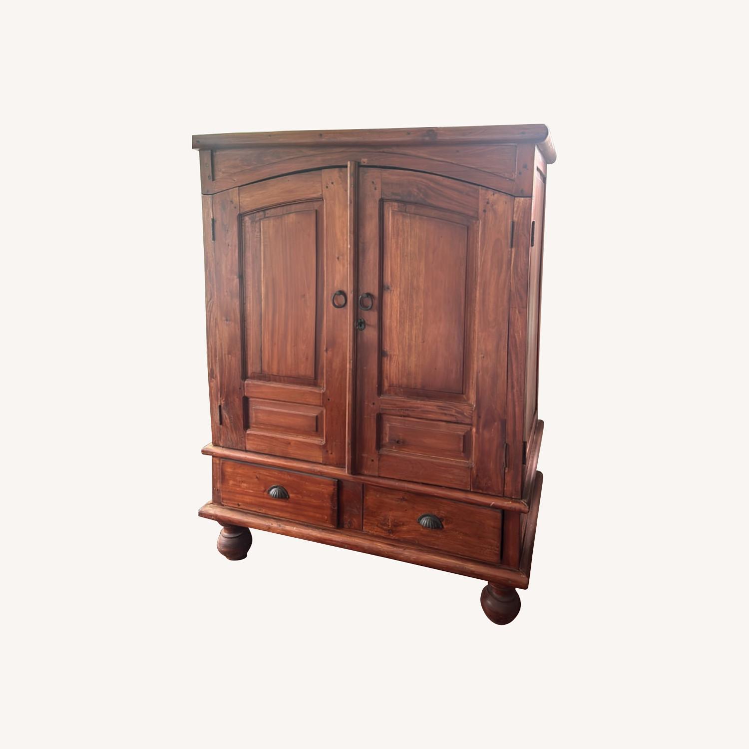 Seller's Notes:Stunning rustic antique armoire measuring 41”w x 53”h x 23”d. Key and latch closure and two functioning drawers on bottom. Very solid and stable. Legs appear to turn inward but the piece stands firm and doesn’t teeter. Sun faded on one side.