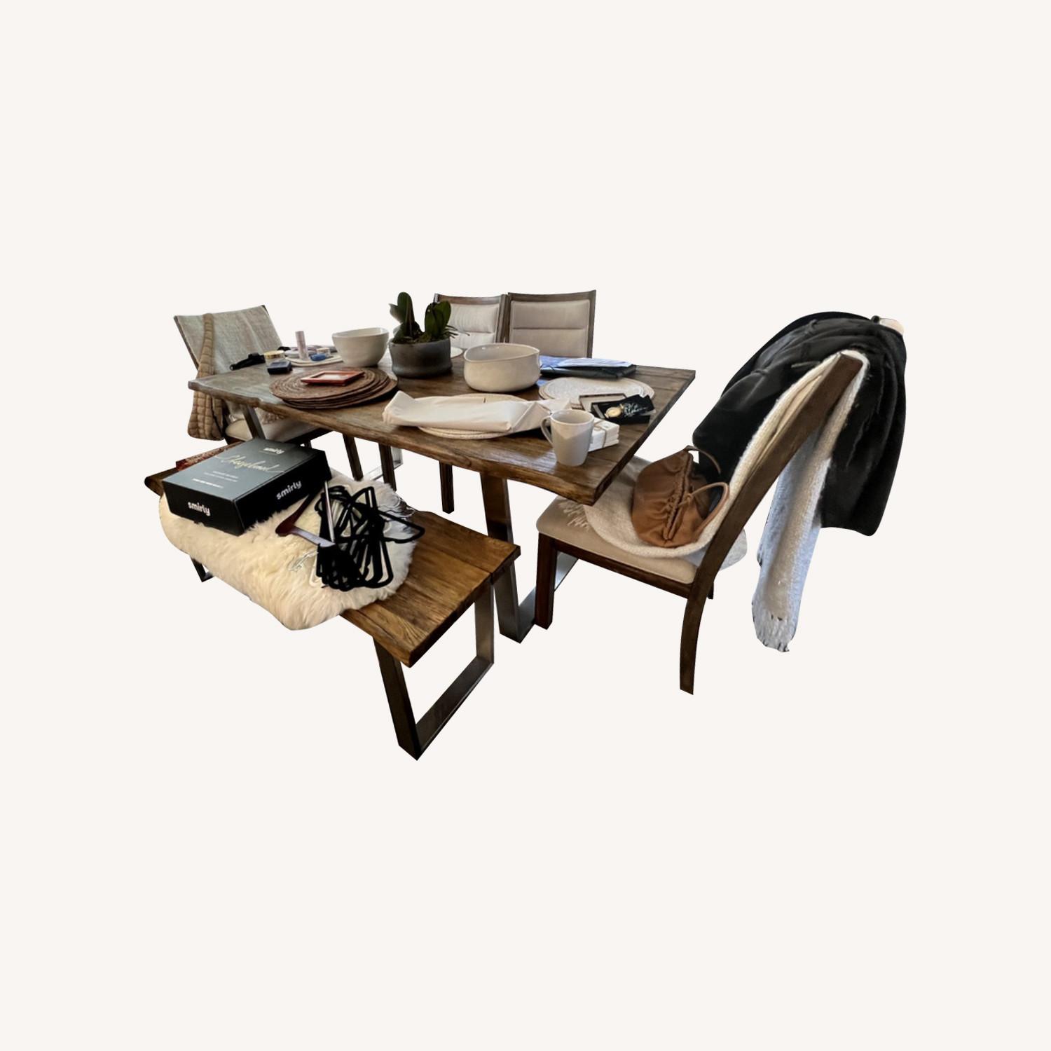 Seller's Notes:Rustic Wood Dinning Table Set includes four chairs and two seater bench