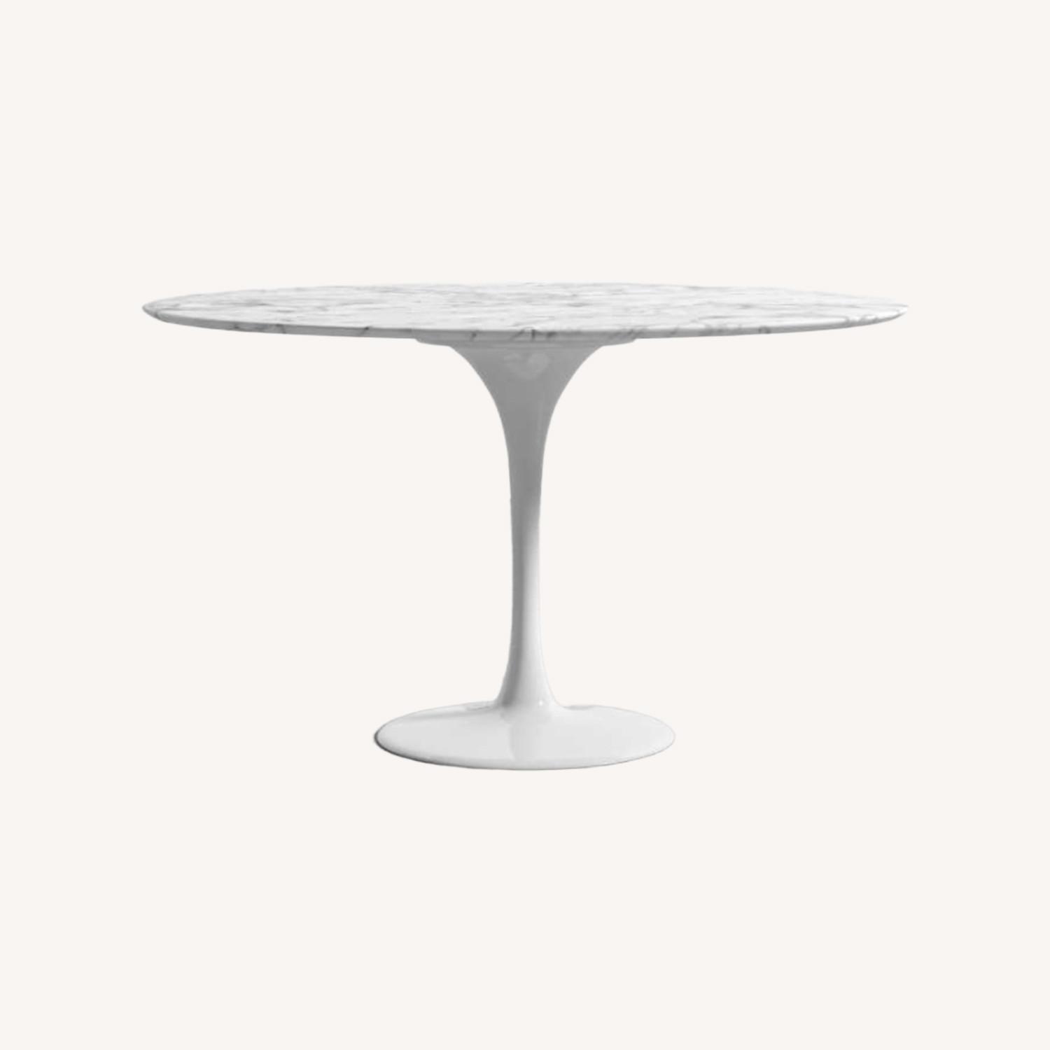 Seller's Notes:Authentic Knoll Saarinen round dining table with original white marble top and pedestal base.