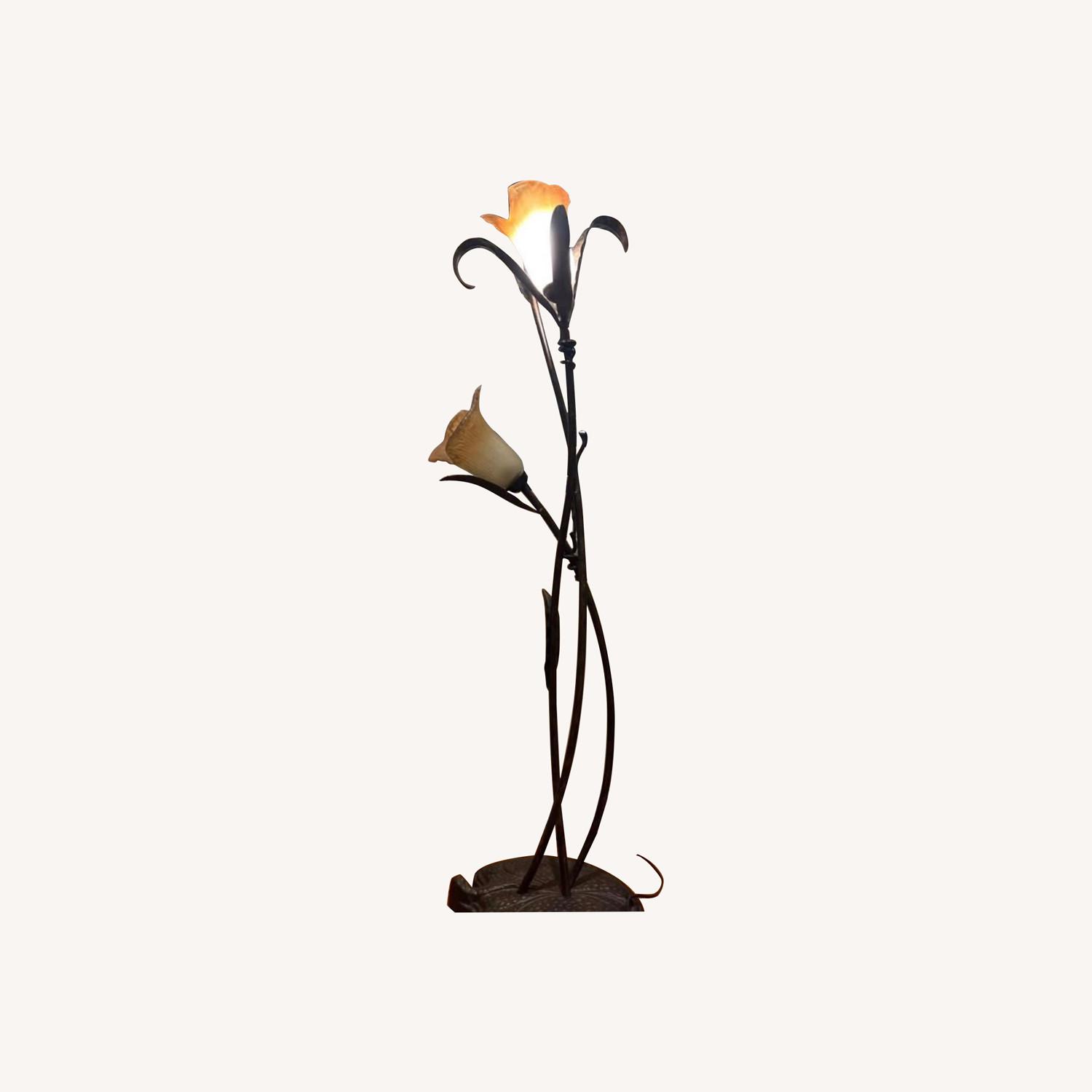 Seller's Notes:Franklin Iron Works Rustic Farmhouse Sculptural Floor Lamp Standing 68 1/4" Tall Bronze 3-Light Amber Glass Intertwined Lily Flower Shade for Living Room Reading Bedroom Office House Home Bring warmth and artistry into your space with this stunning floral floor lamp, featuring sculpted metal stems and hand-blown glass shades that resemble blooming flowers. With its organic curves and rich amber glow, this piece doubles as both lighting and sculpture—perfect for adding character to any room. Features: • Nature-inspired design with curved metal arms and vine-like detailing • flower-shaped glass lampshades in amber and frosted white tones • Sturdy base with decorative shell-like pattern and foot switch for easy operation • Warm, ambient lighting ideal for living rooms, reading nooks, or boutique corners • Unique silhouette that complements vintage, bohemian, or eclectic interiors Dimensions: 68 1/4" Condition: Excellent condition. Fully functional with intact glass shades and clean wiring. Minor wear consistent with age.