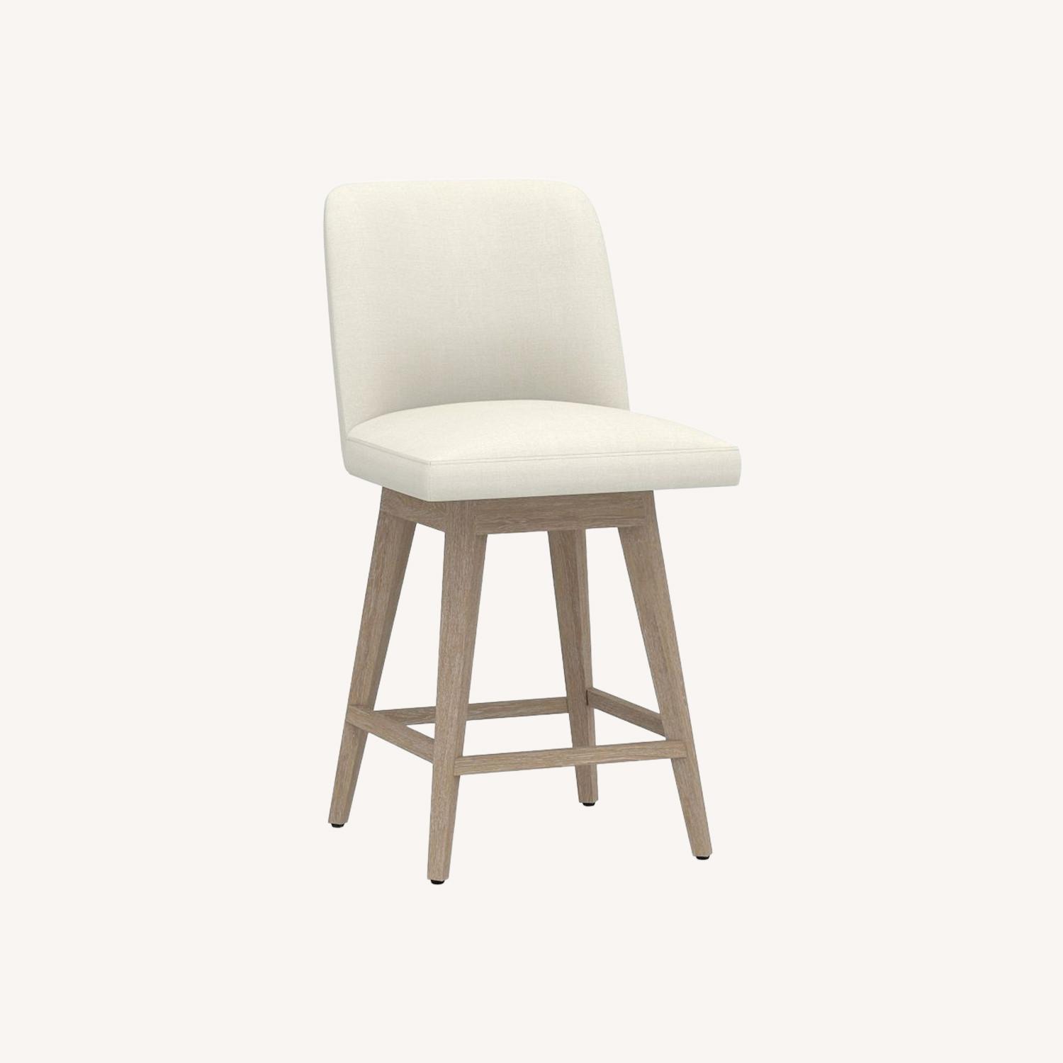 Seller's Notes:The stools in the image are likely the Serena & Lily Ross Swivel Counter Stool. They feature an upholstered seat and back with solid wood legs and an antique brass or brushed nickel kickplate footrest.
