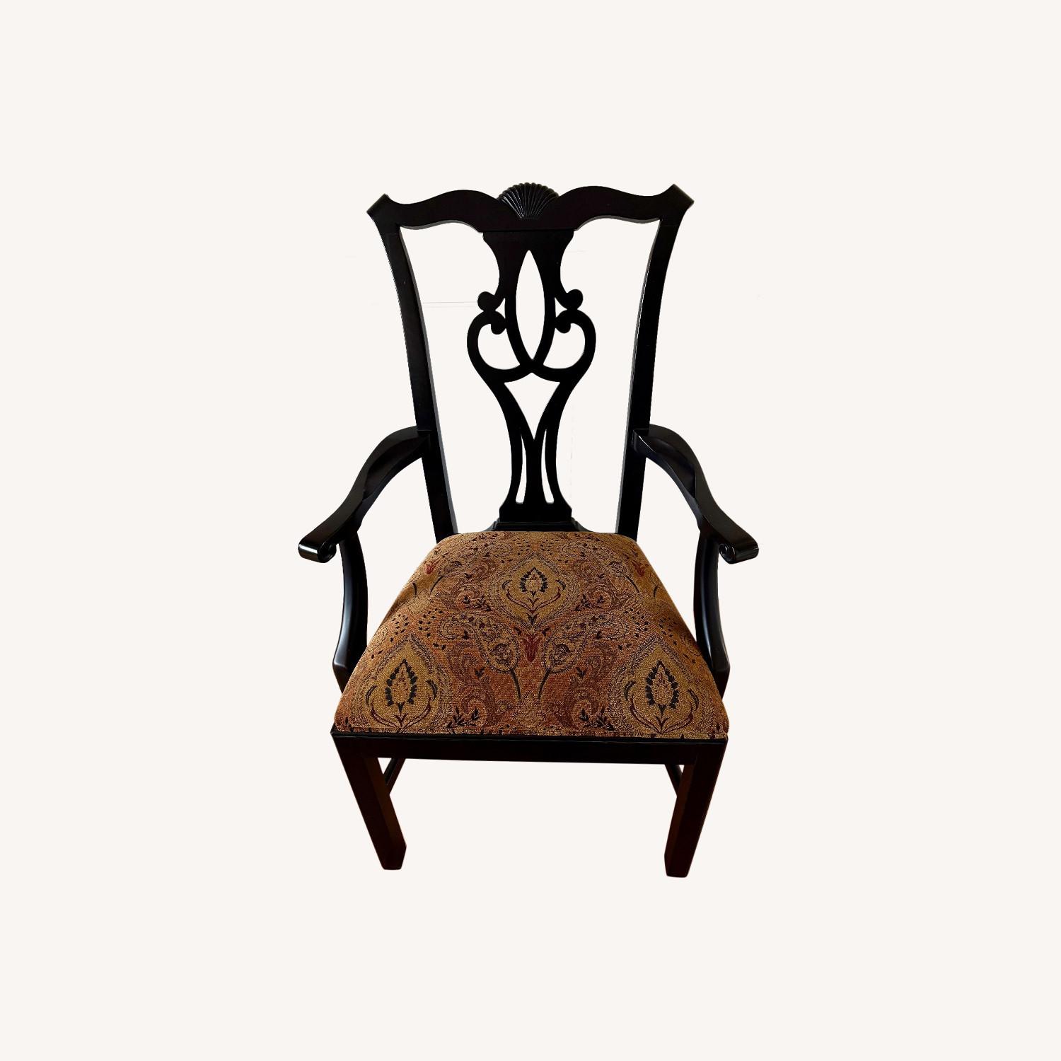 Seller's Notes:Set of 6 Ethan Allen dining chairs in a lightly distressed black finish. Includes 2 armchairs and 4 side chairs with seats upholstered in a warm paisley velvet fabric. Classic Chippendale-inspired backs, solid construction, and excellent condition. Armchair width is 24” and all seat heights are 19”. Timeless look that will add a classic touch to your space.