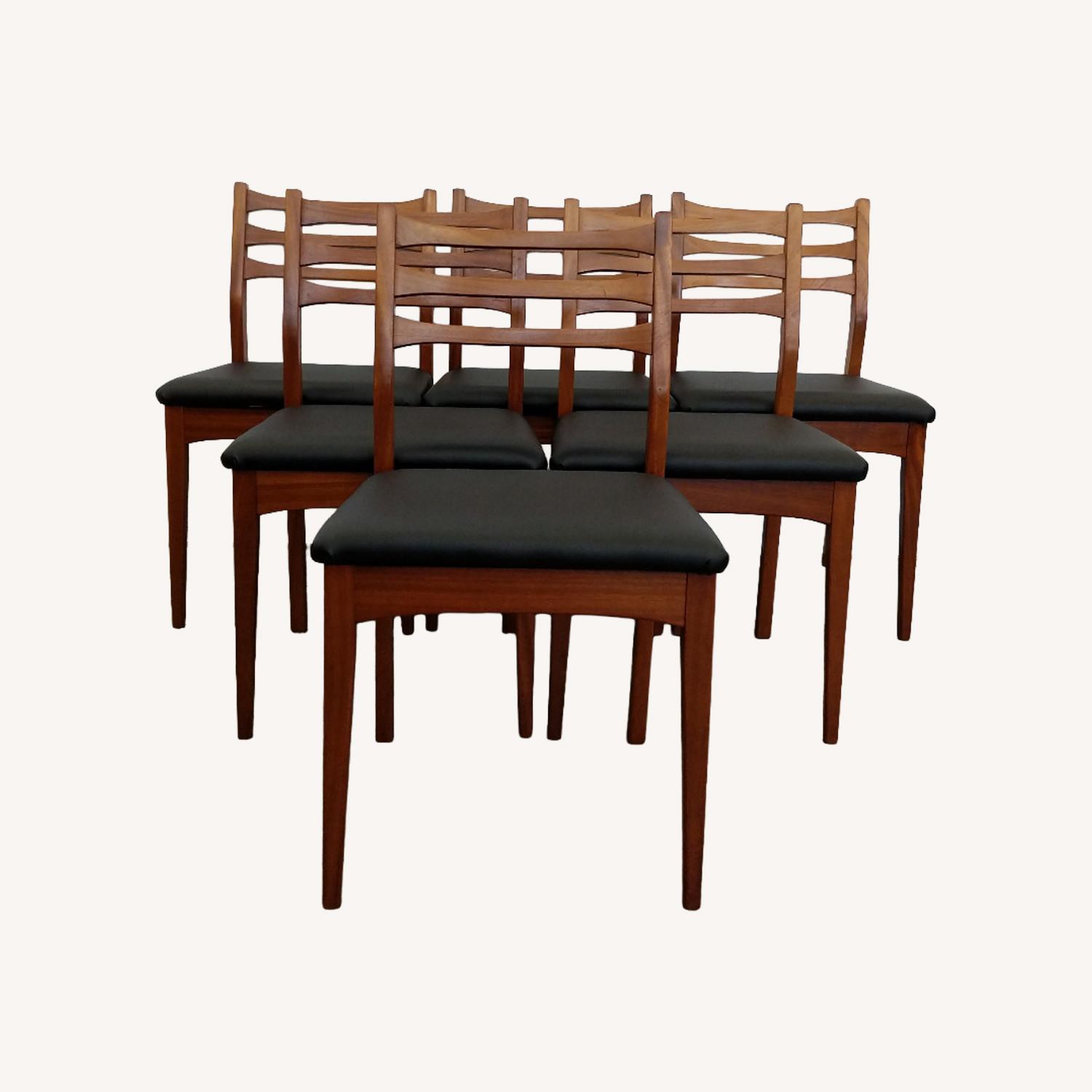 Seller's Notes:Set of 6 authentic vintage mid century modern dining chairs. This set is in excellent condition with brand new black vegan leather upholstery and few signs of age-related wear (see photos). If you would like any additional details, please contact us. Dimensions: 31.75” tall to back 18.25” tall to seat 19” wide 19” deep (approx.) Ref: UK4-060-2
