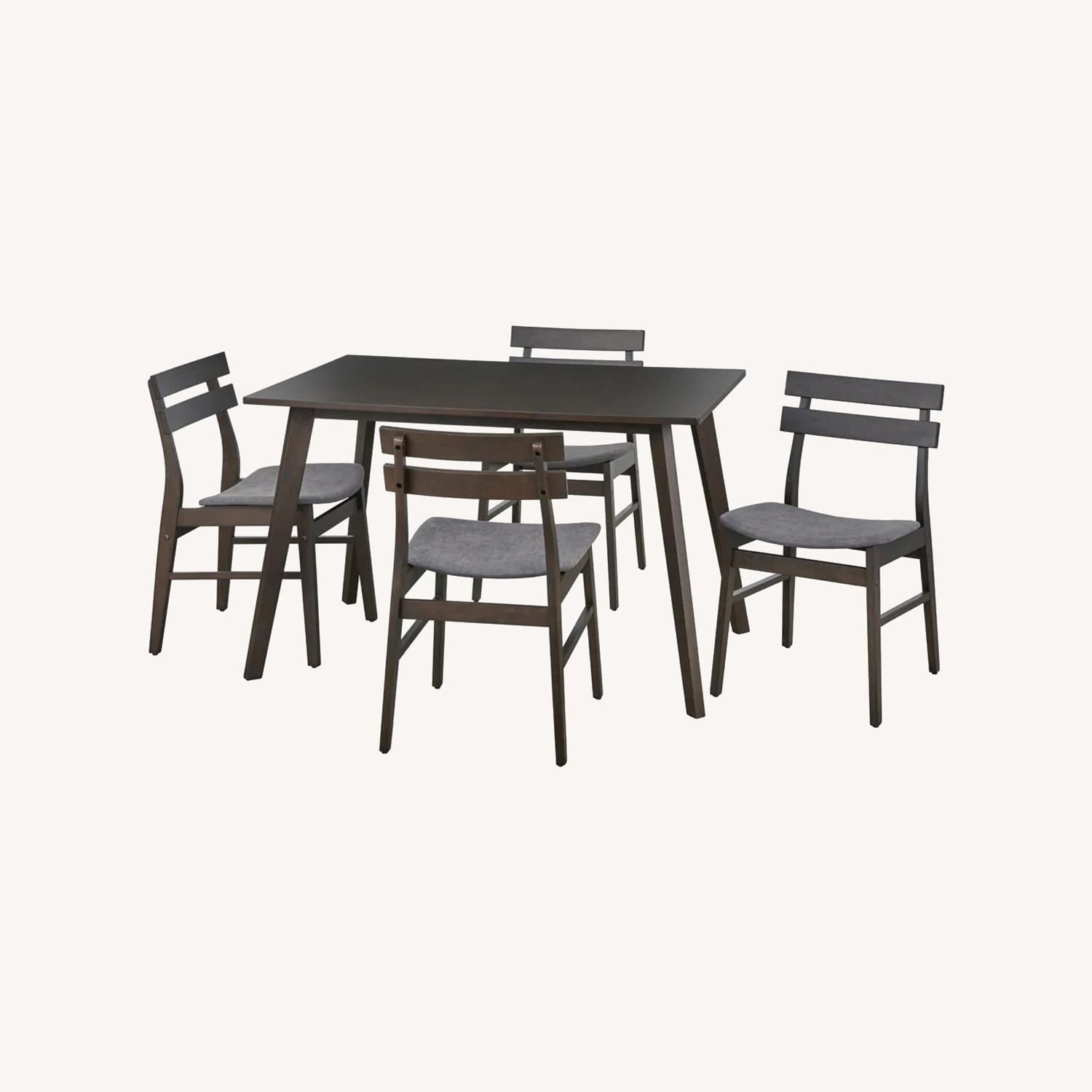 The Simple Living Fiesta Dining Set offers an inviting space for gathering with family and friends, no matter what the occasion. At just over 47 inches wide, the table is perfectly sized for smaller eating spaces as well as formal dining rooms. The warm finish and angled legs have a distinctly Mid-Century modern look. Table legs and chairs are crafted of solid rubberwood. Tabletop is made from durable MDF with beautiful veneers. The matching chairs complete the look with their two-slat designed back and coordinating walnut finish. Seats are topped with a supportive layer of foam cushioning and finished with linen-like upholstery in a dark grey hue.