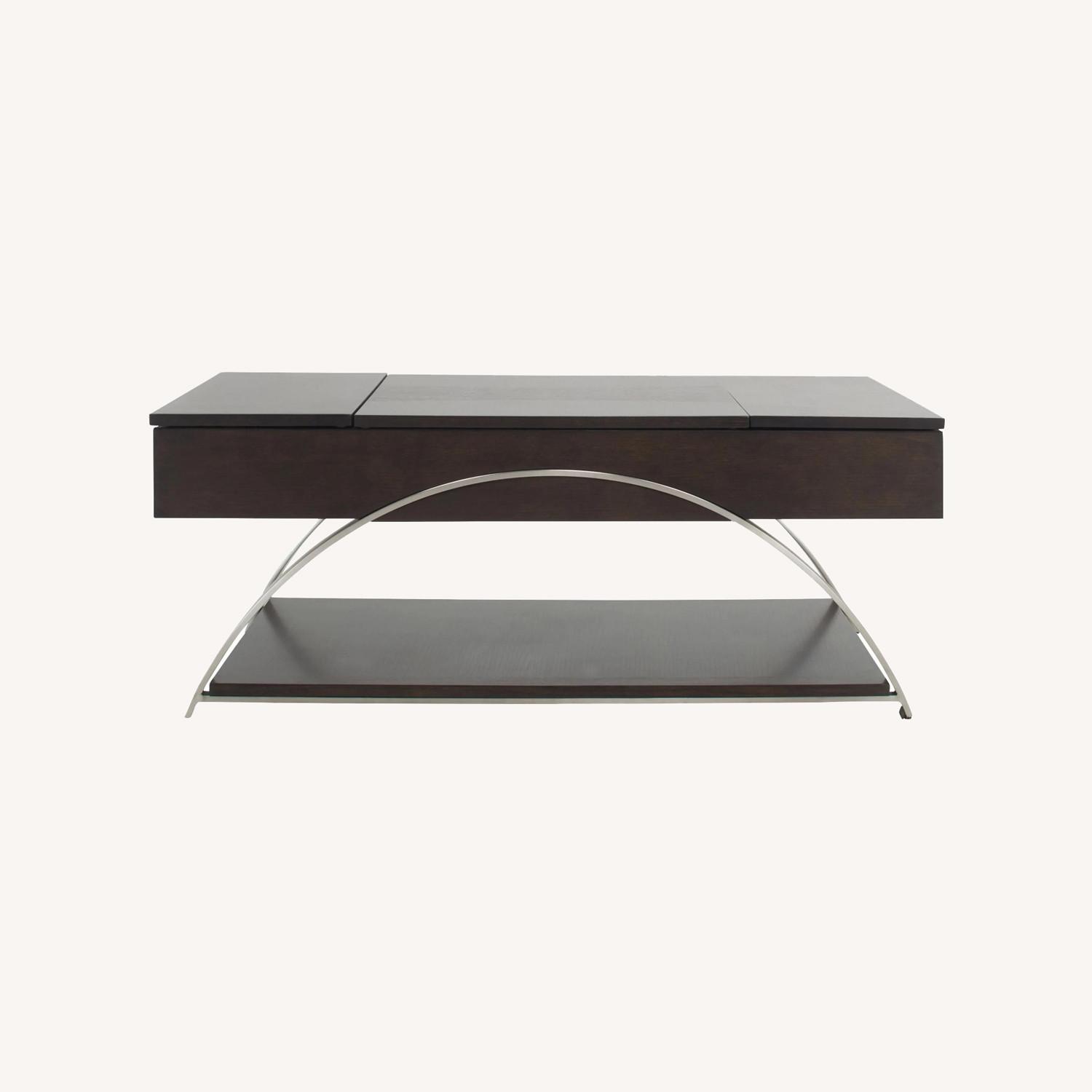 Sleek metal chrome finishes come together with rich, espresso finished wood to create the Sloane cocktail table. The lift-top middle portion combined with the hinged sides reveal three hidden compartments for easy, yet tucked away storage-the perfect fit for any lifestyle.
