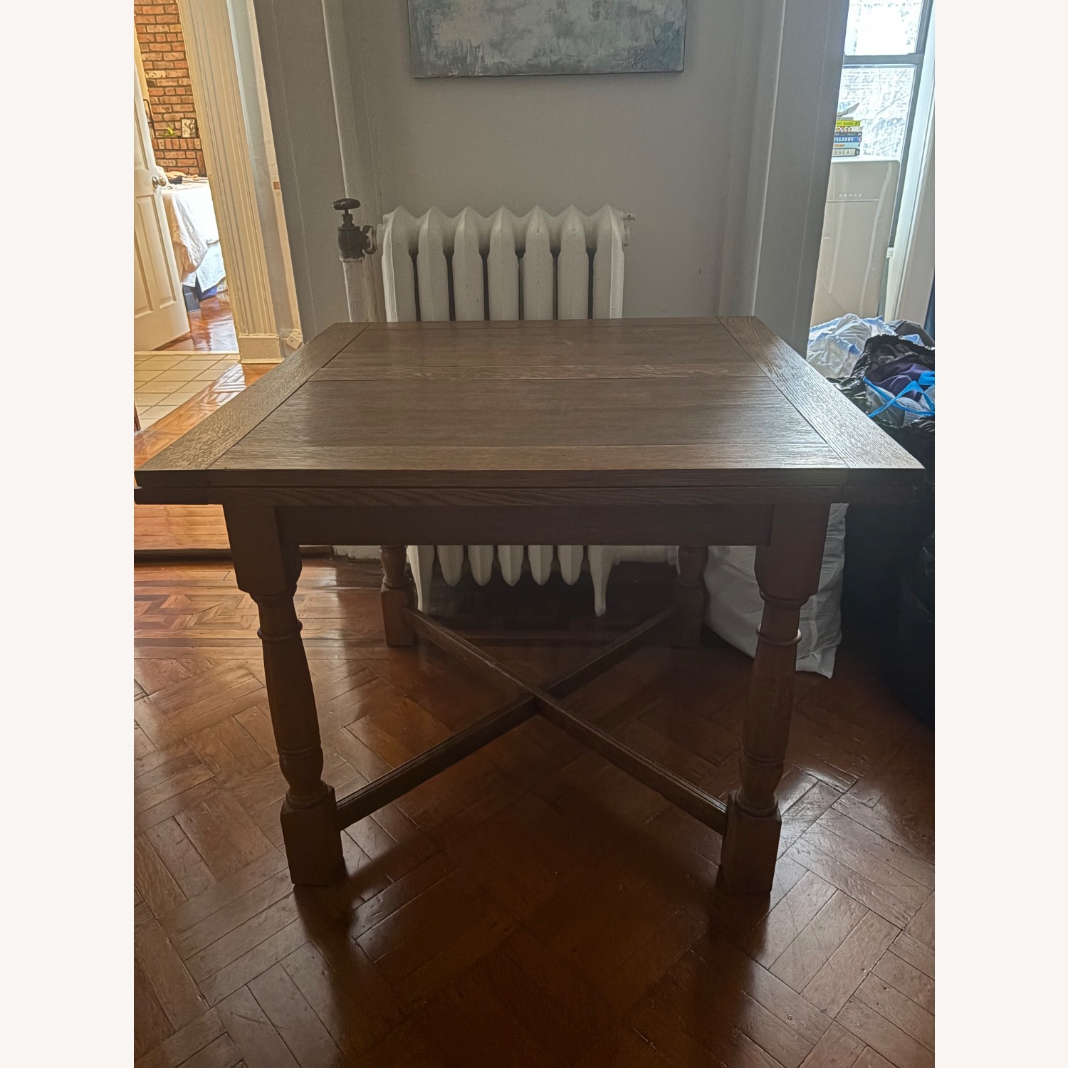 Seller's Notes:Solid wood antique dining table. 3ft x 3ft that can expand with 1ft leaves on either side. Note: the leaves are slightly misaligned from the main table once extended. The table has been in my family for many years but it's in wonderful condition. Unfortunately it won't fit in my new apartment.