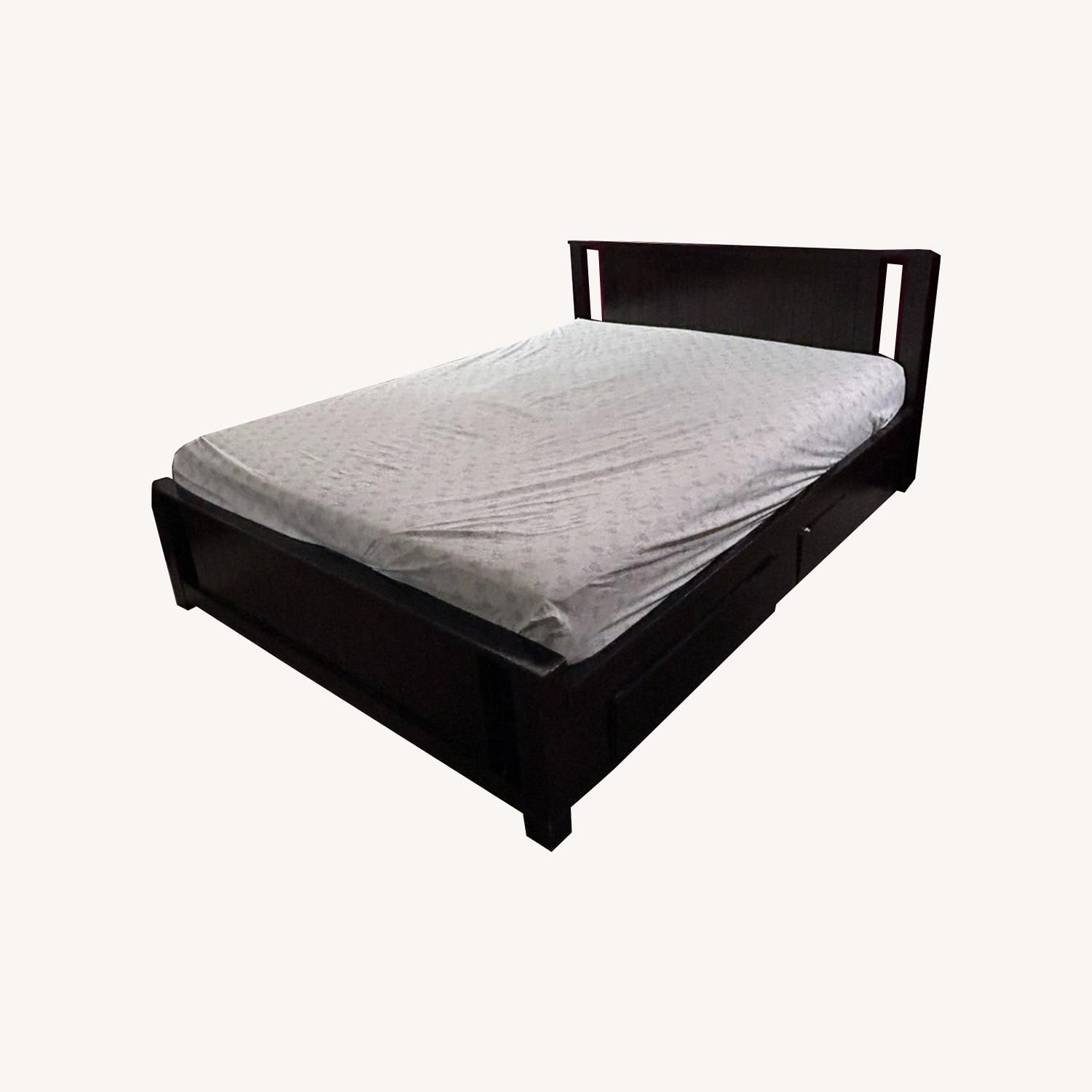 Seller's Notes:Queen size - Solid wood construction, modern and sleek Style & Finish - Modern Look: Features a clean, simple design with a flat paneled headboard that fits well with modern decor. Color: Deep, dark wood polish (Espresso/Dark Walnut tone) that looks great with light bedding. Condition: Structurally in excellent condition and very solid. Has minor cosmetic scuffs/wear on the edges Storage Features: Daily Access: 2 smooth-pulling drawers on the side, perfect for linens or clothes. Deep Seasonal Storage: The mattress sits on sturdy plywood panels. You can lift these panels to access the entire space under the bed—ideal for storing suitcases, winter gear, or boxes. Details: Material: Solid wood frame (heavy construction) with a plywood mattress support base. Assembly: It disassembles for transport. Dimensions: For queen size mattresses, bed frame size - 65"X85"