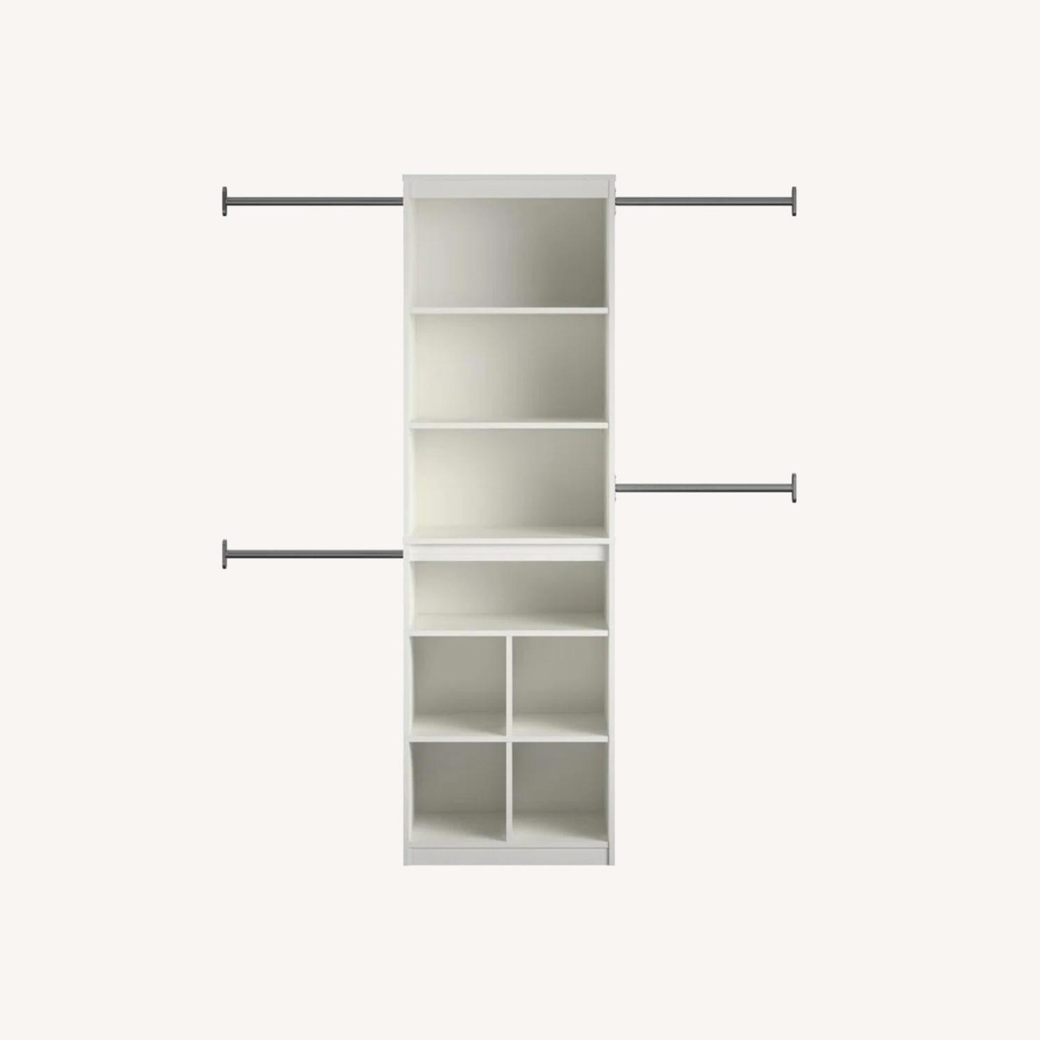 This closet system kit makes clothing organization a breeze. It's made in the USA from engineered wood and mounts onto the wall in your closet. This organizer has four center shelves (one is adjustable) for folded sweaters and shirts. The bottom half features four shoe cubbies that are ideal for organizing shoes or handbags. Plus, four adjustable rods extend from the sides so you can hang your suits, slacks, and dresses.