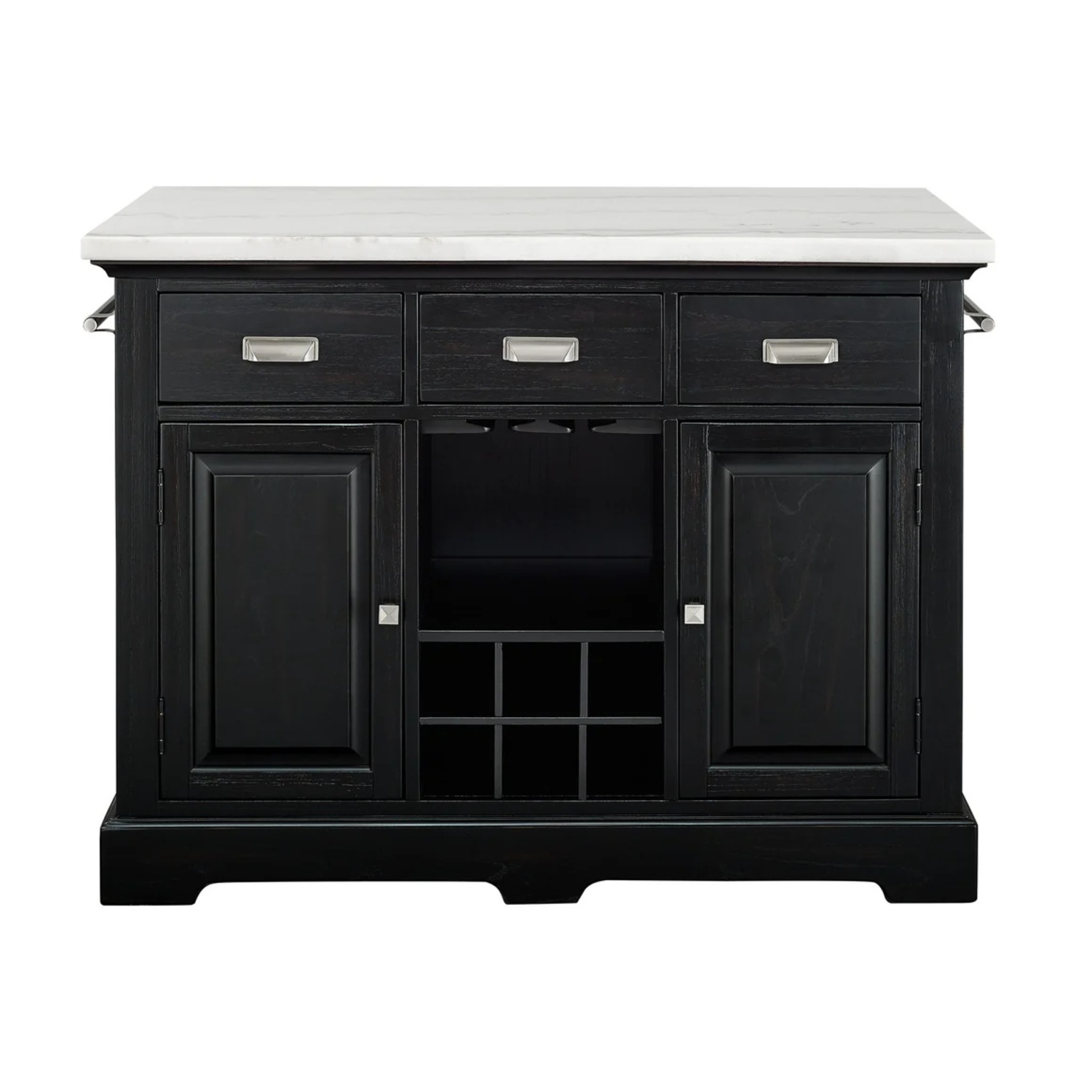 The Aspen Kitchen Island is sure to be your hub for all kitchen activity with its vintage styling and modern edge. Features abound with a luxurious marble top, storage drawers, cabinets, wine rack, stemware storage and more. The pewter cup hardware and towel rack accent the ebony wood finish for a piece that will add beauty and function to your home for years to come.