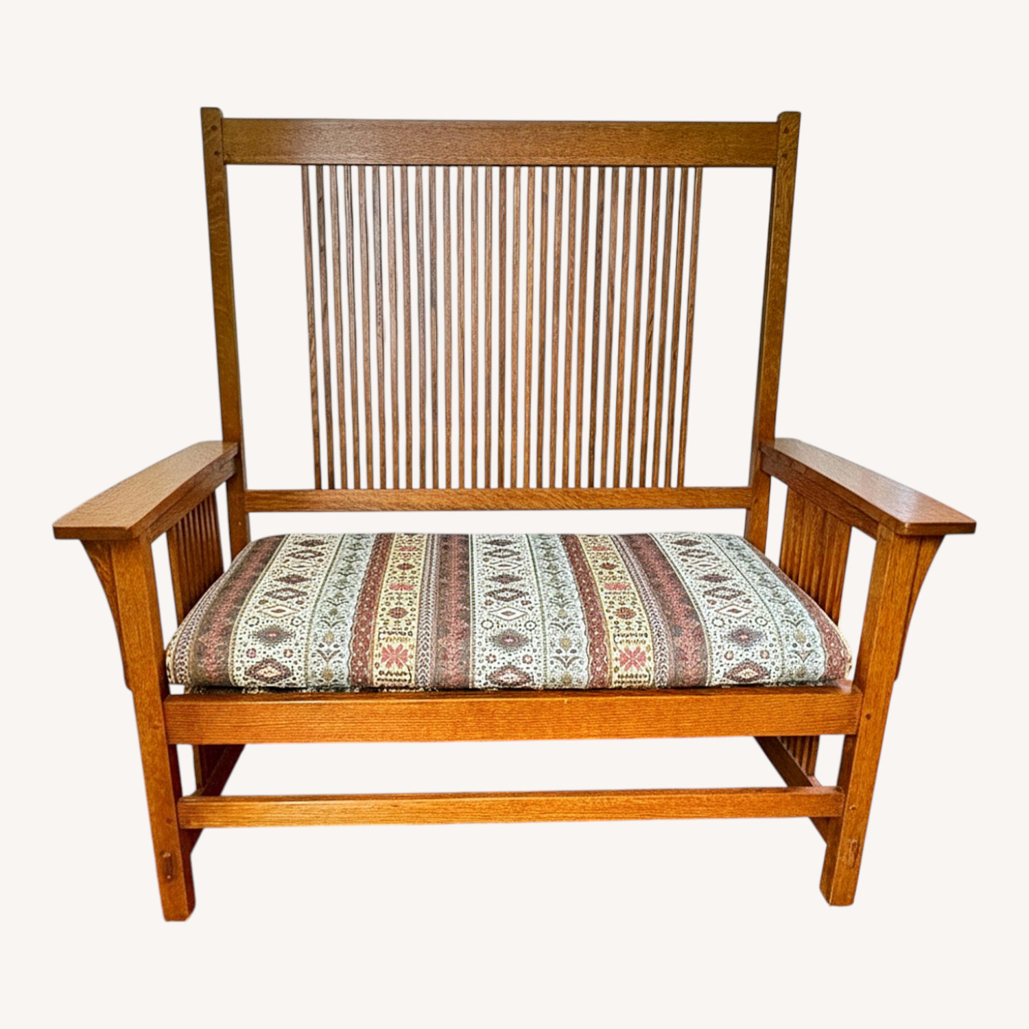 Seller's Notes:A gorgeous Mission or Arts & Crafts style spindle bench, settee, or love seat. American Made Oak Wood Frame Settee Bench with Custom Upholstery, by L. & J.G. Stickley 1990s. Solid quarter sawn oak. Original removable and zippered custom upholstered cushion. Seat height 18" Open to offers. Condition Consistent with age and use. Dimensions 43.25" x 22.5" x 48.5"
