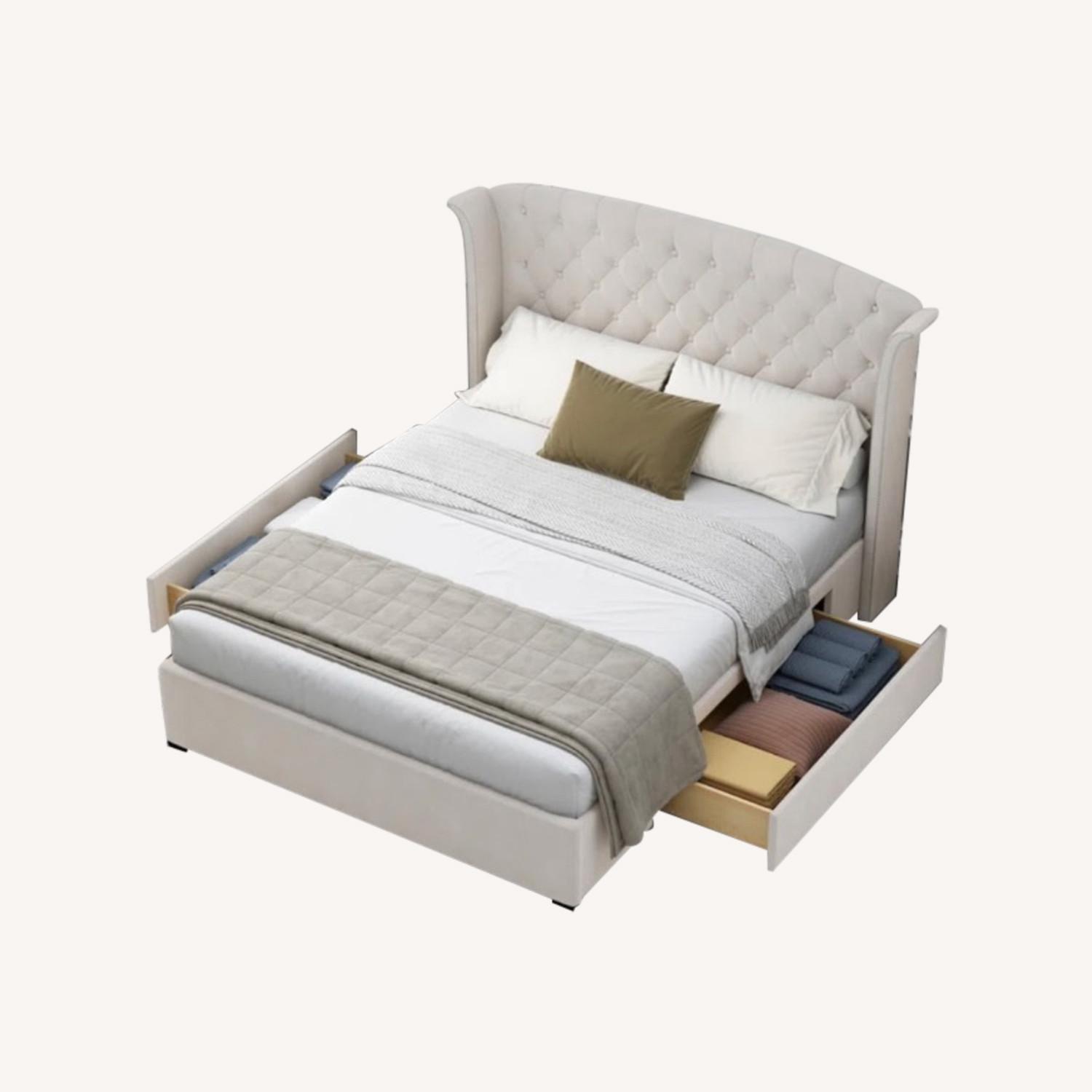 Luxurious Upholstered Platform Bed with High Headboard & Dual Drawers Elevate your bedroom with this sophisticated platform bed, featuring a 58-inch high headboard that creates a stunning focal point. The dual storage drawers glide smoothly and provide ample space for clothing, all while allowing easy access without disturbing bedside tables.