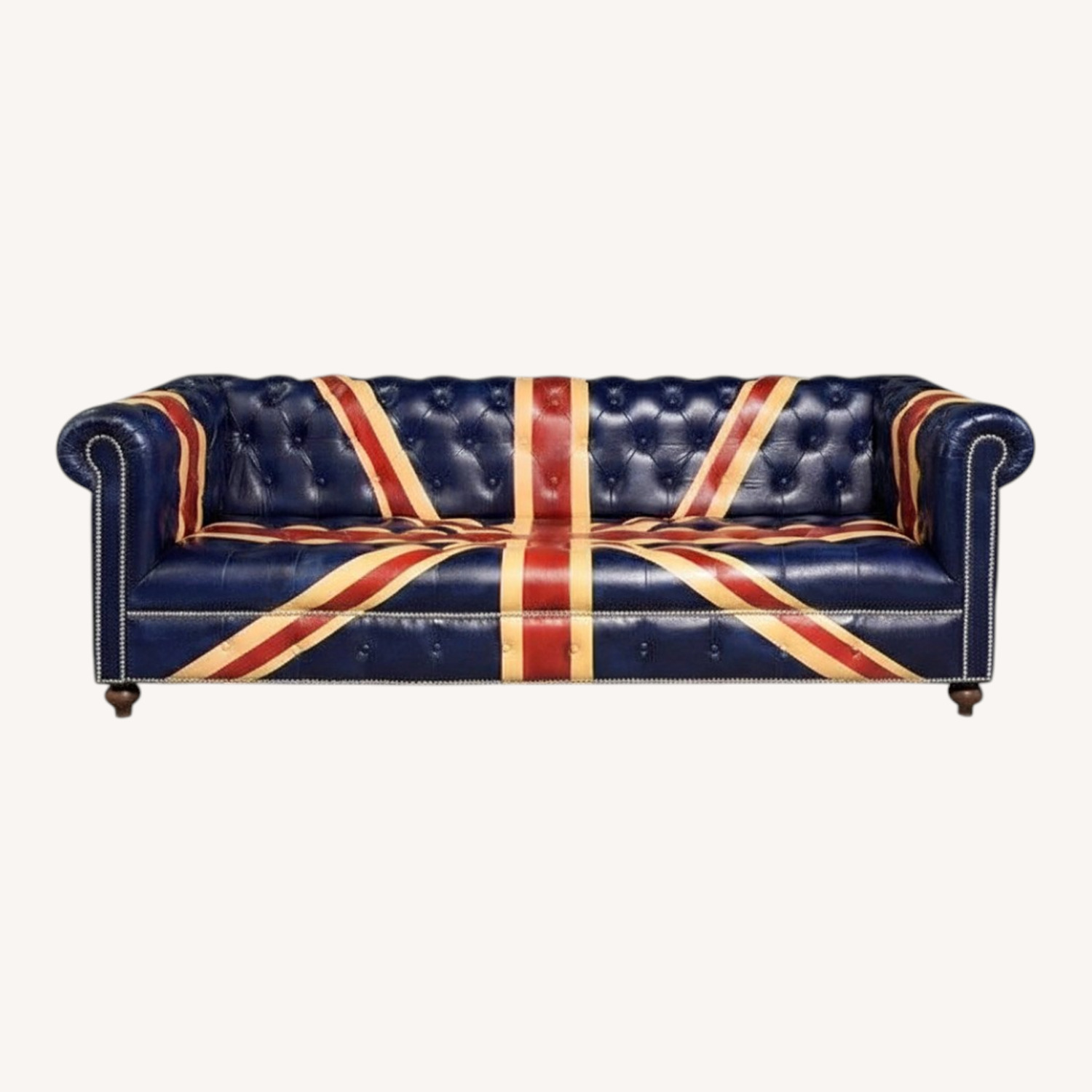Seller's Notes:Union Jack Leather Chesterfield British / English Style Sofa - 28 in tall x 84 x 33.5, Seat height is 16 inches, Seat depth is 23 inches and the width is 67 inches - This has been painted in the Union Jack Flag motif. We bought this and just had it delivered but it does not fit the space. Very unique Chesterfield sofa painted with a Union Flag motif.