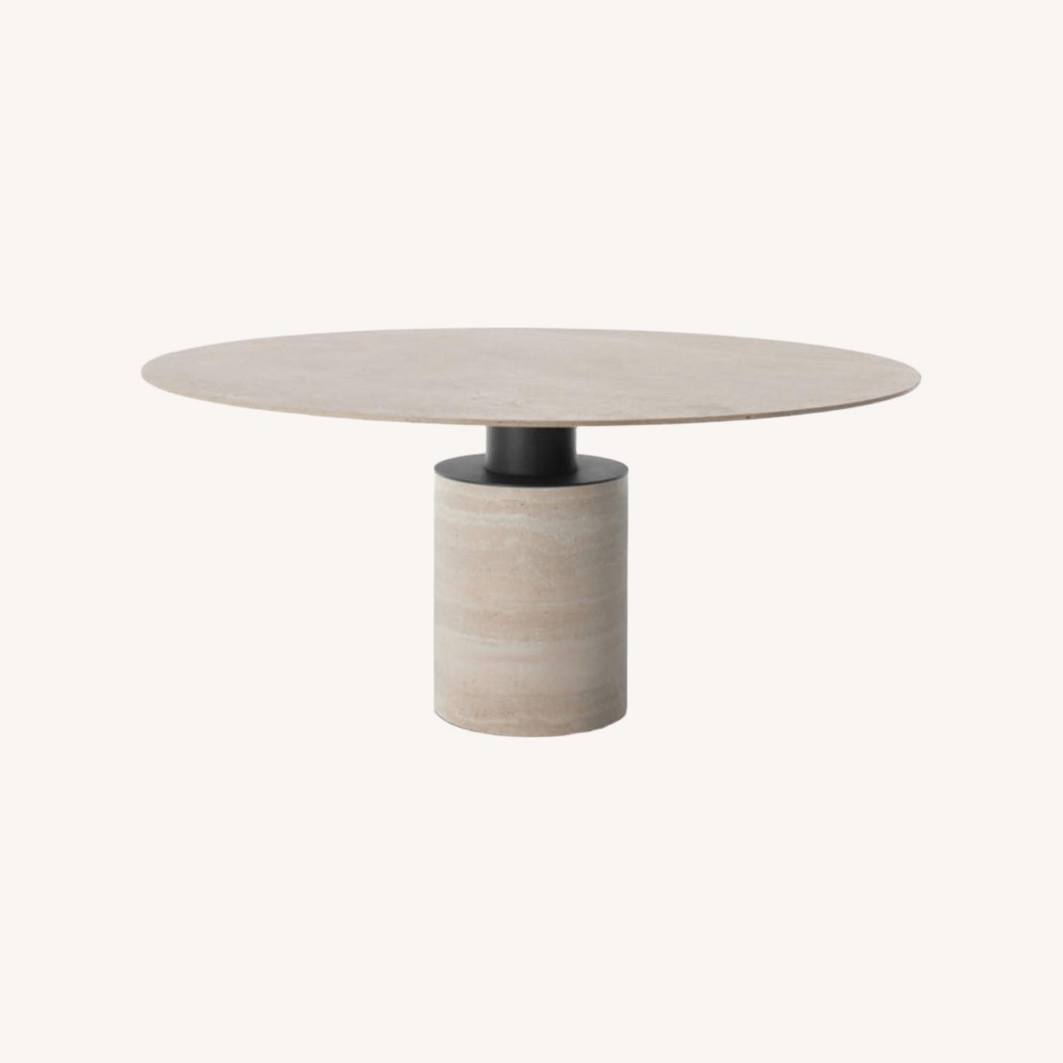 The round tabletop (130 cm / 51.5 inches diameter) is made of cross-cut travertine, giving the surface a beautiful, lunar-like texture. The solid pedestal base is vein-cut travertine, where the natural linear grain and richness of the stone are fully visible. The contrast between cuts highlights the character and quality of the material.