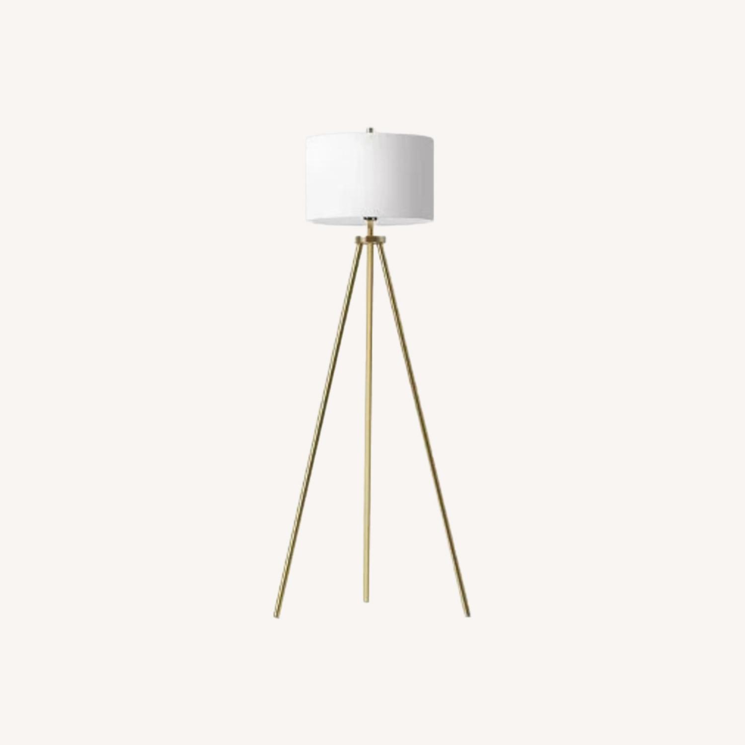 Seller's Notes:Tripod lamp in excellent condition. Will include lightbulb. Gold color is lighter than pictured - more a faded brass that feels more neutral than bright gold. Shade is slightly off white.
