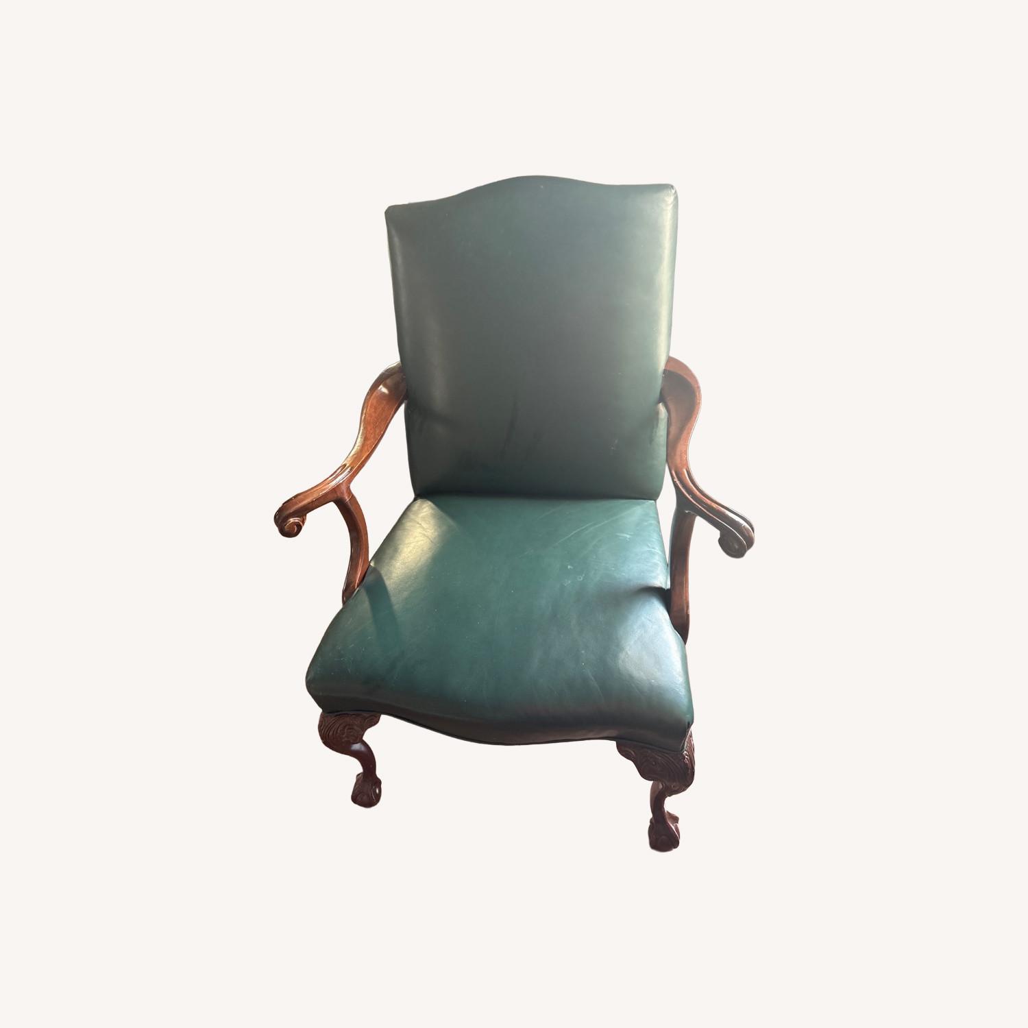 Seller's Notes:classic upholstered armchair with a traditional, formal vibe. The chair has deep green leather upholstery on the seat and back, showing some natural wear and creasing from use. The frame and arms are made of dark, polished wood with carved details, including curved arms and cabriole-style legs that end in decorative feet. Overall, it looks like a well-made, older piece—comfortable, sturdy, and suited to a study, library, or formal living