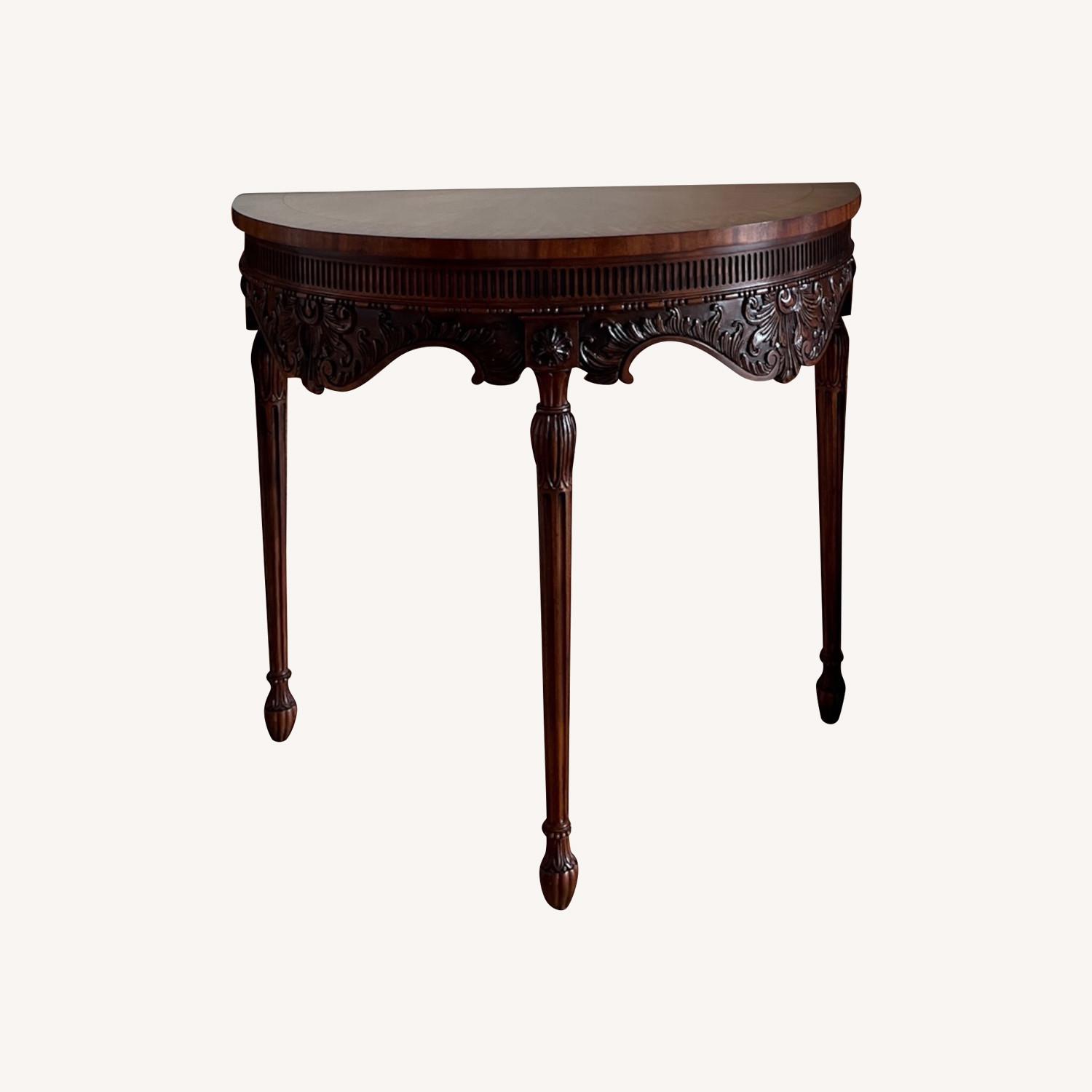 Seller's Notes:Henredon Half-Moon Console Table – Elegant Craftsmanship This Henredon half-moon table exudes timeless sophistication with its intricate detailing and graceful curved design. Ideal for an entryway, living room, or as an accent piece, this table is a statement of fine craftsmanship and luxury. 2 available….price listed above is for each****** Key Features: • Premium Construction: Solid wood with a rich, warm finish for durability and timeless appeal. • Half-Moon Design: Space-saving silhouette perfect for hallways or against walls. • Ornate Carvings: Features intricate floral and scrollwork carvings along the apron and legs. • Tapered and Fluted Legs: Delicate yet sturdy legs with detailed carvings add a touch of elegance. • Versatile Use: Complements traditional, classic, or transitional interiors. Dimensions:40”w, 20.5”d, 36”h Condition: * Both in excellent condition. Zero damage. Smoke, pet hair free home. Please view photos and ask as many questions needed to trust your purchase. This table combines beauty and function, offering a piece of furniture that will elevate any room.