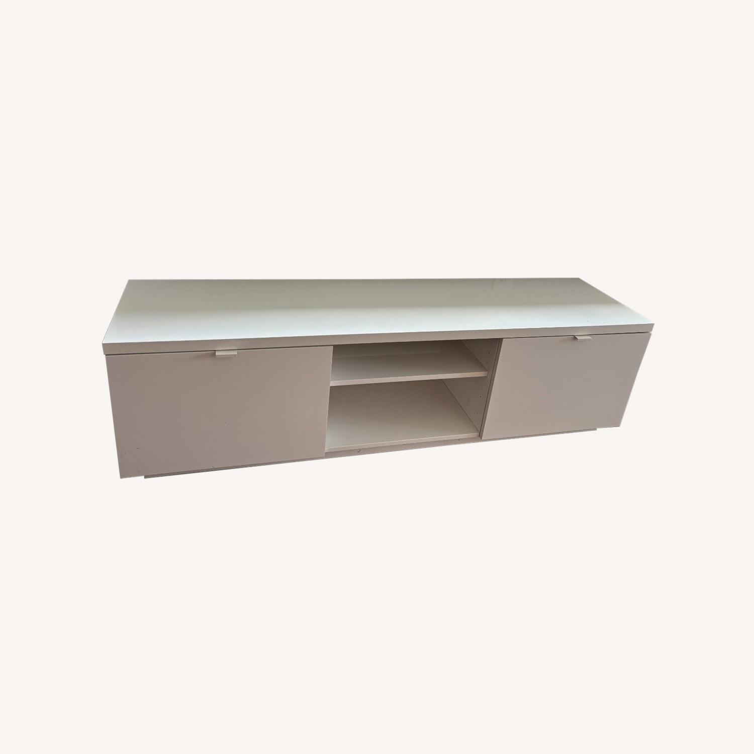 Seller's Notes:TV/Media console in a glossy white finish. We don't know the brand as it came with our old apartment, but it is high quality and feels solid. There are only a few blemishes on the top that could be easily re-stained or hidden. Has two drawers, which each have interior shelving as well as exterior shelving in the middle portion.