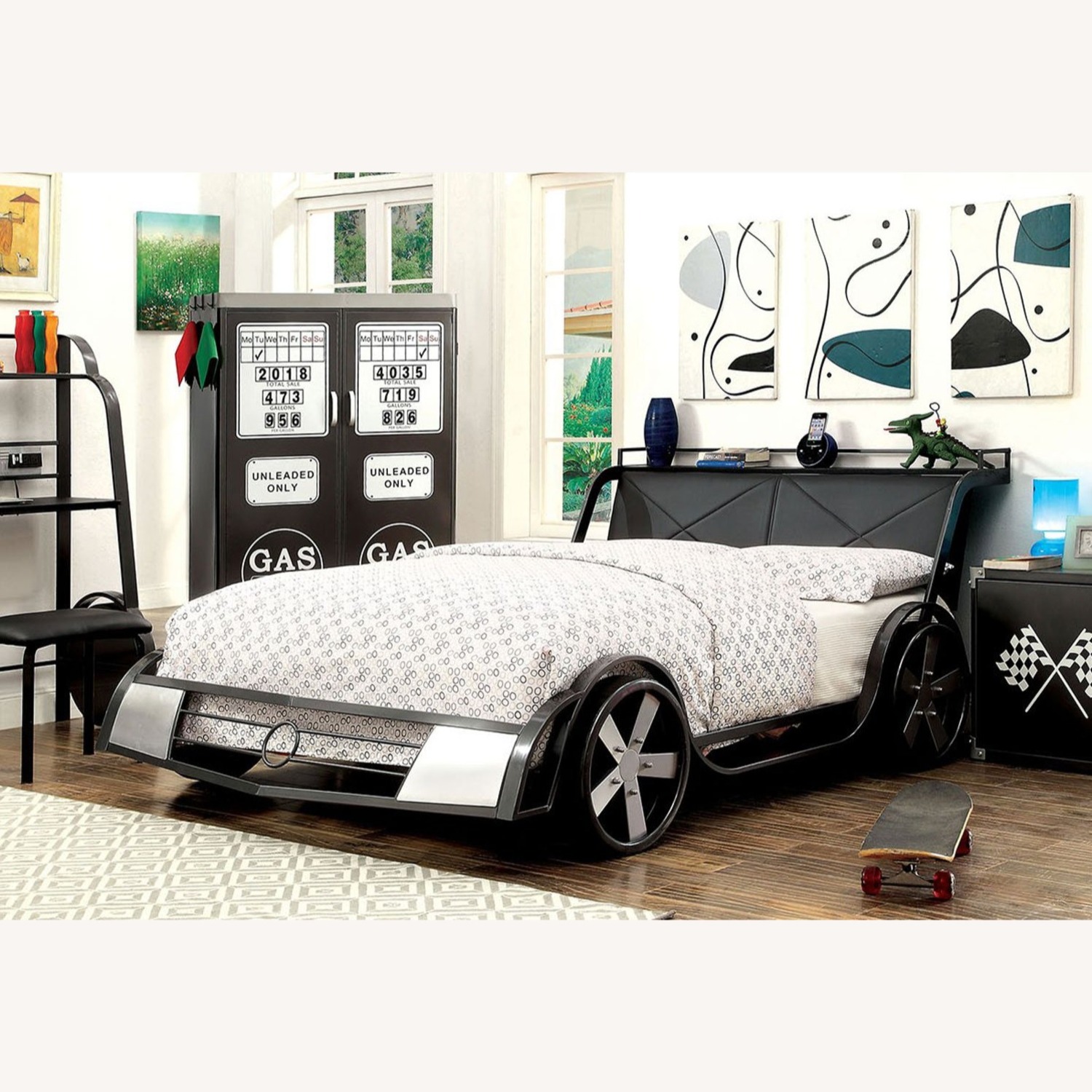 Seller's Notes: Features: Sturdy metal construction Silver and gun metal frame Padded leatherette headboard Headboard shelf Realistic wheel accents Car design Slat kit included DepartmentFurniture of America Kids Beds