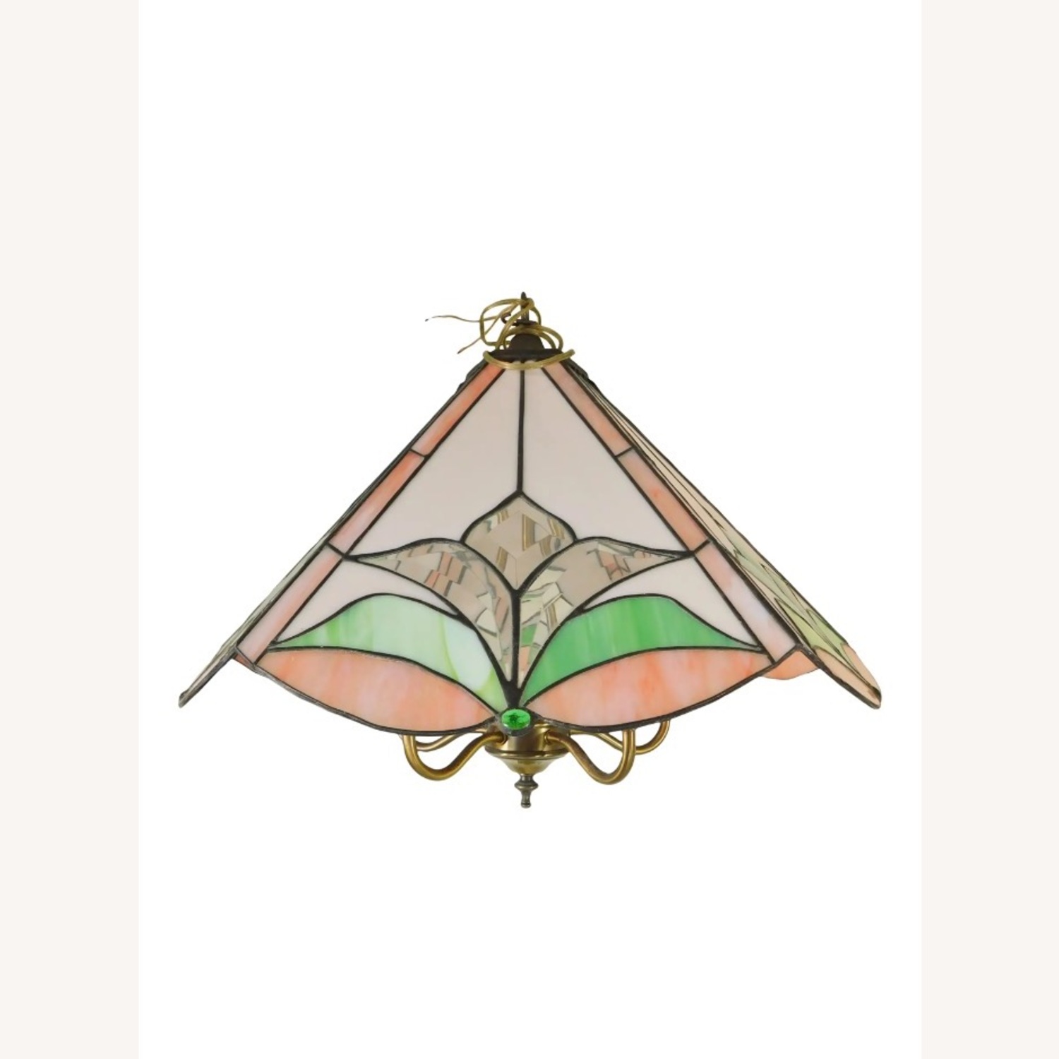 Seller's Notes:Beautiful vintage mid century pink and green stained glass and brass 5 light chandelier. Made in the USA - Circa 1970s. Wonderful ornate shape and design. Brass 5 light candelabra underneath. Works perfectly! No breaks, cracks, repairs, or damage. Chain has already been added (shown in some pictures). Enjoy!