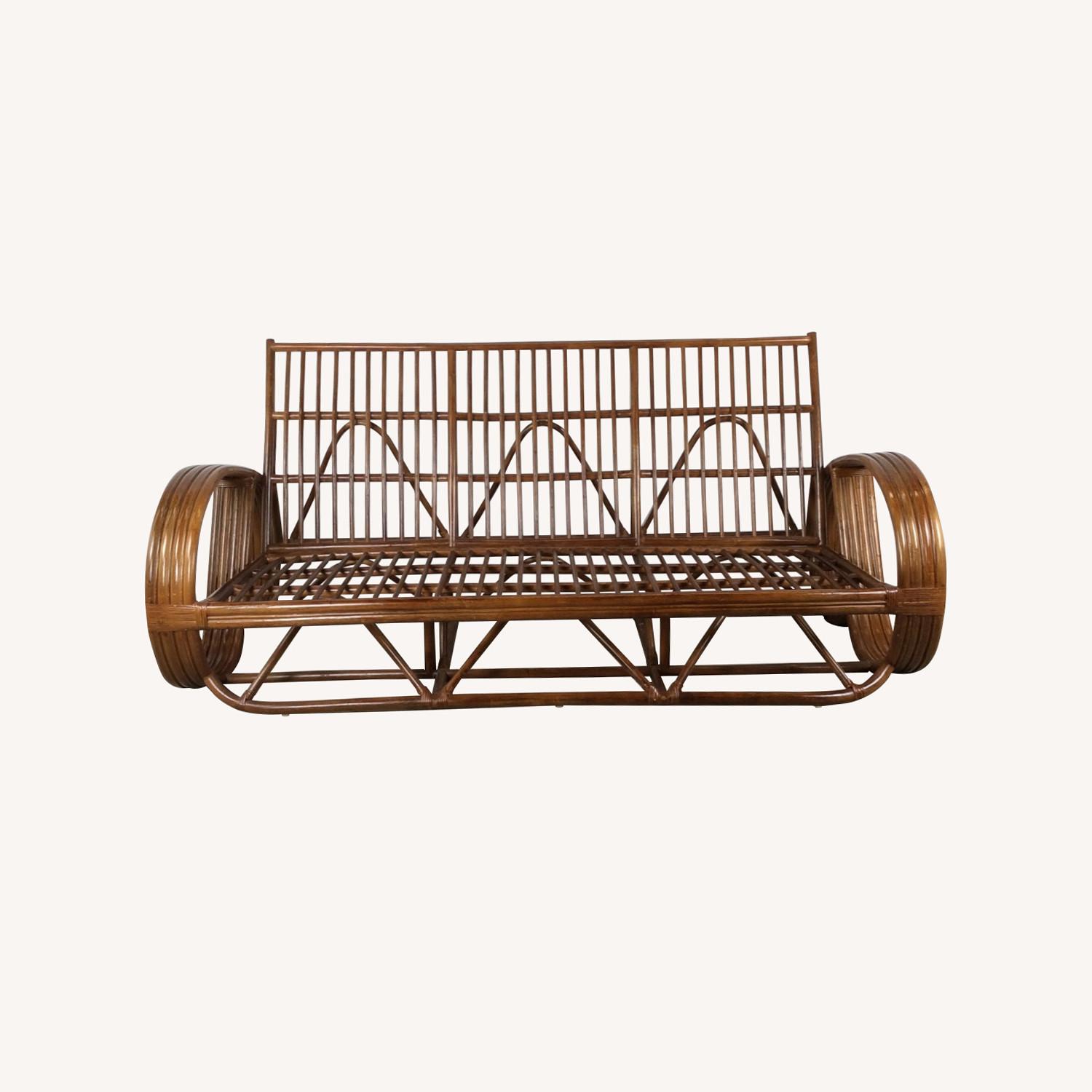 Seller's Notes:This vintage boho chic sofa frame in the style of Paul Frankl features solid rattan construction, original finish, unique pretzel style arm rest and base. Dimensions: 77w 34d 34.5h 12.5sh Condition notes: Original finish is in good condition. There are some areas where the finish has worn / rubbed off due to age and regular use (see photos). The finish wear is generally along the bottom edge of the base and along the back of the seat (see photos). Overall this frame is very sturdy and the original finish is clean. No cushions available. Seat dimensions are 67.5 wide & 23.5 deep. Back dimensions are 67.5 wide and 27.5 high. 8/10 Shipping: Local pickup by appointment at our Red Bank NJ 07701 warehouse. Local curbside delivery within 75 miles starting at $250. Nationwide shipping available. Please contact with your zip code for a delivery quote PRIOR to initiating purchase. Delivery rates are calculated on a PER PIECE basis factoring in delivery logistics such as elevator building or 12 flight walk up, etc.