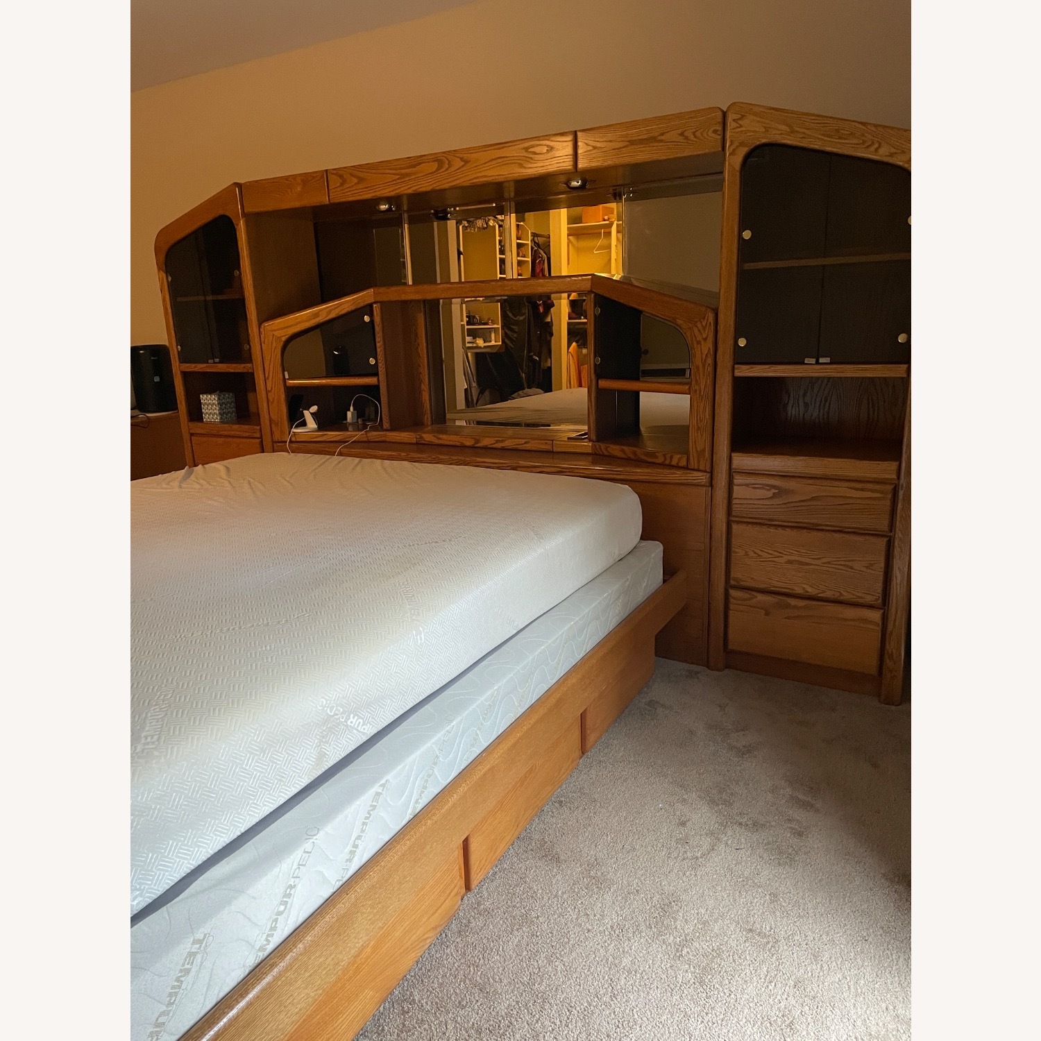 Seller's Notes:Arbek Cascade/Expectations Collection – Tall Wall Group King Bed w/ Towers, Lights, Mirrors & Storage. Unique furniture and family heirloom that has been kept in great condition. Original instruction manual and screws for assembly. Minor blemishes of scratches near the base. Minimally visible. Top of headboard was used to store plants so some minor water spots on top of frame. Bed has drawers on both sides with shelving units. Hidden storage in the headboard with a cutout for a tissue box. Glass mirrors and doors which are great for a display of keepsakes or additional storage. Electrical hookup for ease of connecting phones chargers, laptop, or medical devices. Dimmable lighting built into the headboard and shelves. Underbed storage- 3 per side. Towers have one hidden drawer w/ a mirror top plus 2 additional drawers per side. Headboard has 3 hidden drawers on top of the frame. [12 drawers + 3 upper cabinets, 1 hidden cubby in headboard + 10 shelves. For comparable items online search "Coronado Platform wall unit bed"
