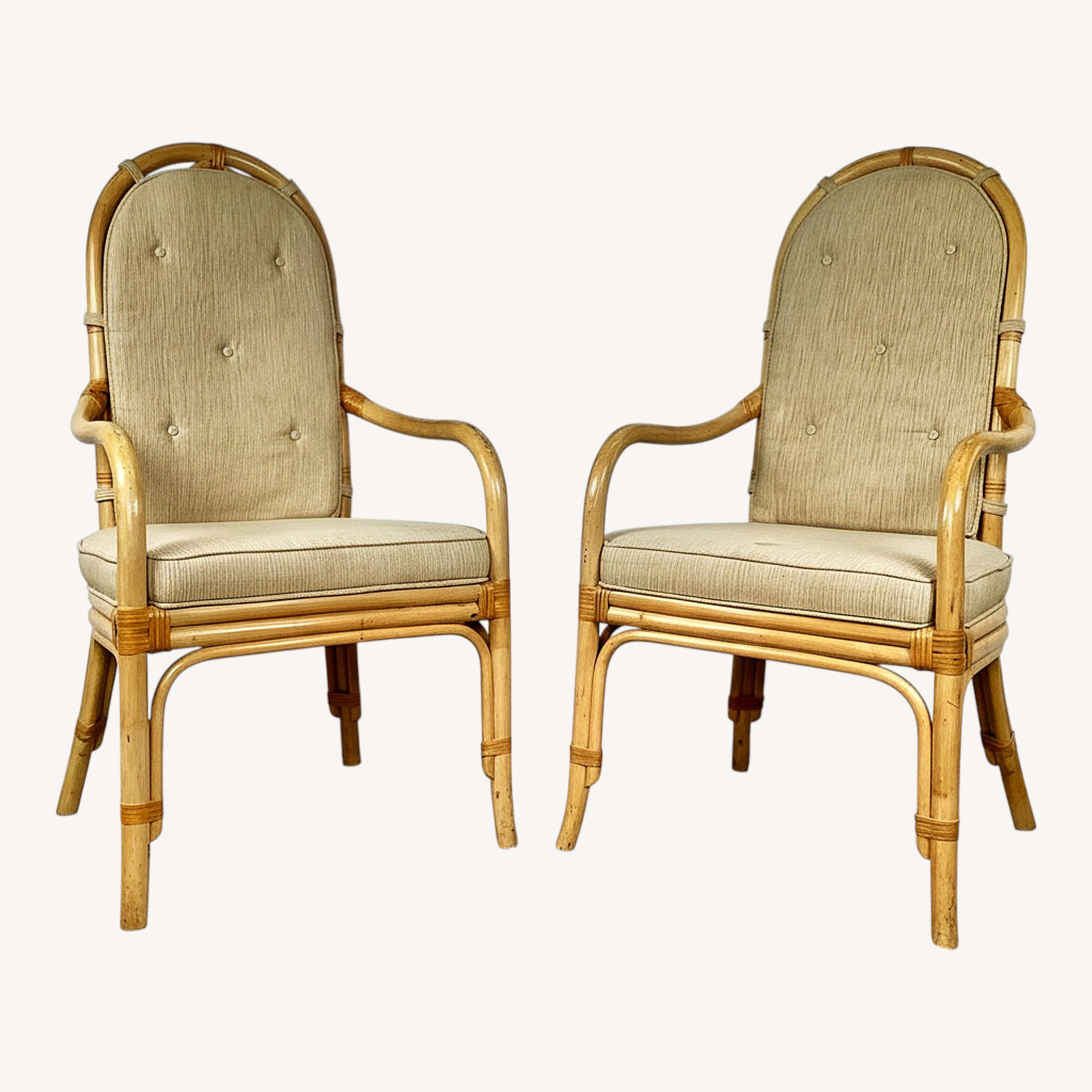 Seller's Notes:This pair of Henredon high-back bamboo armchairs captures the laid-back luxury of mid-century tropical design. With their gently arched backs, sculpted arms, and warm natural finish, the chairs showcase a style that feels both relaxed and refined. They invite you to slow down, sink in, and enjoy the calm presence that natural materials bring to a room. The bamboo frames maintain their original soft honey tone, accented by traditional wrapped joints that highlight the hand-crafted nature of the construction. Each curve feels intentional and organic, giving the chairs a sense of movement and airiness. It’s a design that fits seamlessly into coastal homes, eclectic spaces, or any interior that celebrates natural textures. The included cushions add comfort and balance to the sculptural frames. Their neutral fabric and tufted details complement the vertical height of the chairs, bringing softness without detracting from the bamboo’s visual rhythm. Together, the two elements create a look that is effortlessly harmonious. These chairs excel as accent seating in living rooms, bedrooms, entryways, reading corners, or sunlit indoor-outdoor areas. Their tall backs help them function beautifully as statement pieces, yet they remain adaptable enough to blend with a wide range of décor styles. They’re equally effective styled symmetrically or separated throughout the home. Durability is a hallmark of Henredon’s craftsmanship, and these chairs remain structurally sound with a sturdy, well-balanced feel. The bamboo has aged with grace, maintaining its natural charm while retaining dependable strength. This makes the pair both visually appealing and genuinely usable. If you’re looking for seating that brings warmth, character, and relaxed sophistication into your space, these Henredon bamboo armchairs are a perfect choice. They deliver mid-century craftsmanship, natural beauty, and an inviting presence in every room. Dimensions: 22.5w 22.5d 42.5h 25ah 19sh Condition: age appropriate wear, vintage finish worn, scuffs/scratches, edge wear, discoloration, minor losses, see photos.