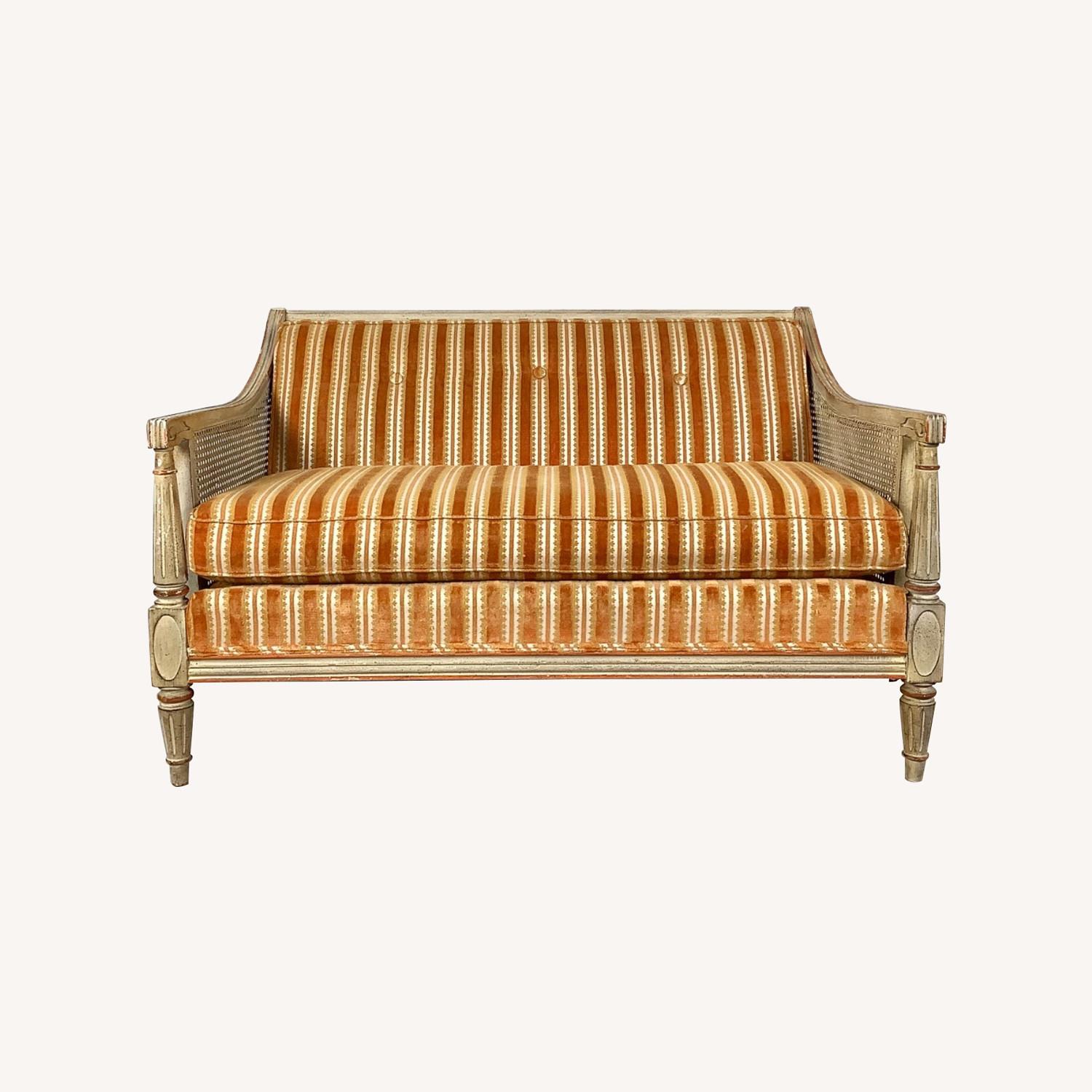 Seller's Notes:This French-inspired settee blends classic Louis XVI lines with the warmth and charm of vintage craftsmanship. The carved wood frame features fluted legs, oval medallions, and subtle detailing along the arms and lower rail. The silhouette feels elegant yet relaxed, making it a versatile addition to many décor styles. The caned sides introduce a beautiful woven texture that adds airiness to the design. This open element balances the more tailored lines of the cushions and gives the settee an inviting, breathable quality. The gentle slope of the arms softens the structure while maintaining the recognizable French profile. The striped upholstery in rich gold and warm neutral tones enhances the piece’s vintage character. Both the tufted back cushion and the cushy bench seat make it comfortable for lounging, reading, or conversation. The fabric pattern brings a sense of opulence while still remaining approachable. This settee is well-suited for a foyer, a bedroom seating area, or a living room corner where a bit of decorative charm is desired. With the right styling—books, a throw, perhaps a small side table—it can transform a simple space into a curated vignette. The design closely follows 18th-century French models, but the materials and overall construction indicate it is a later revival piece, most likely crafted in the mid-20th century when such forms were widely reinterpreted. Full of warmth, texture, and timeless style, this settee adds effortless sophistication to any interior. Dimensions: 45.25w 33d 29h Condition: age appropriate wear, vintage finish worn, scuffs/scratches, edge wear, discoloration, losses to caning, fabric worn, see photos.