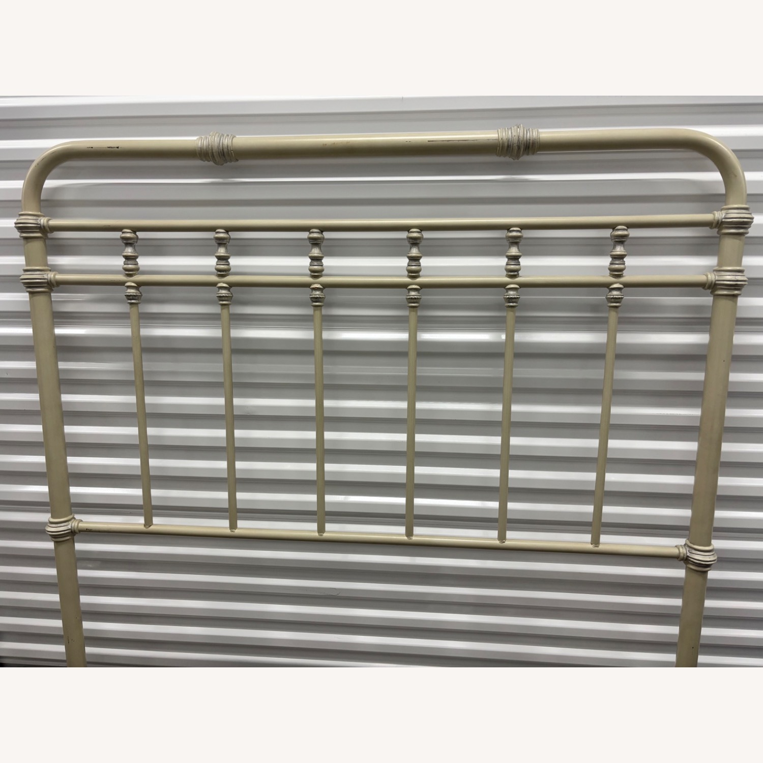 Seller's Notes:Title: Vintage Metal Spindle Headboard Condition: Good vintage condition with light wear consistent with age Dimension: (see measurements above) Description: - Metal construction with spindle detailing - Cream painted finish with vintage character - Rounded corners and decorative finials - Works with full or queen-size mattress - This headboard brings timeless cottage and farmhouse style to any bedroom. Style: Vintage / Cottage / Farmhouse