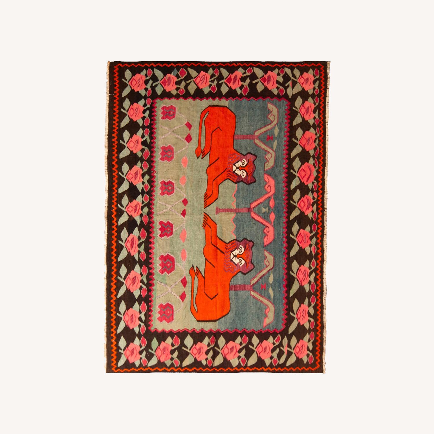 Seller's Notes:Hand woven in wool between 1950-1960, this vintage mid-century Persian Kilim enjoys a sought-after pictorial design hailing from the Karabagh (Karabakh) region, renowned for the selection of patterns that have emerged from this area since antiquity. This particular depiction of lions in repose amongst nature marries a uniquely clean, meticulous approach a geometric animal motif with a very European sense of floral imagery, and the almost juxtaposition of the look of shading and dimensionality in the pink and green floral motifs of the border to the greater emphasis on rich, solid red, blue, and green hues in the field offers a sense of movement complementing the very culturally dignified aesthetic offered in this item. In all the playful variations and rarities in the recent animal pictorial acquisitions our team has reviewed, this piece boasts a sharpness of graph and a unique play of whimsy and boldness that lends such a collectible, conversational addition to a variety of areas seeking these versatile dimensions.