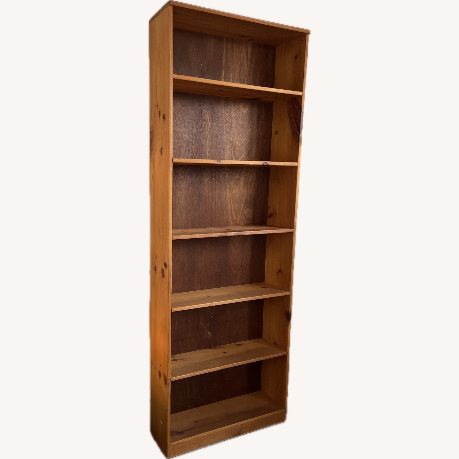Seller's Notes:Handcrafted solid wood 6-shelf bookcase. Hand stained in warm natural finish. Tall profile maximizes space and holds lots of books/art. Dimensions: H 83.5 in., W 30 in., D 9.25 in. Top shelf height is 10.5 inches, other 5 shelves height is 13 inches. Condition: age appropriate wear, scuffs and scratches, one small chip on bottom left, interior marks.