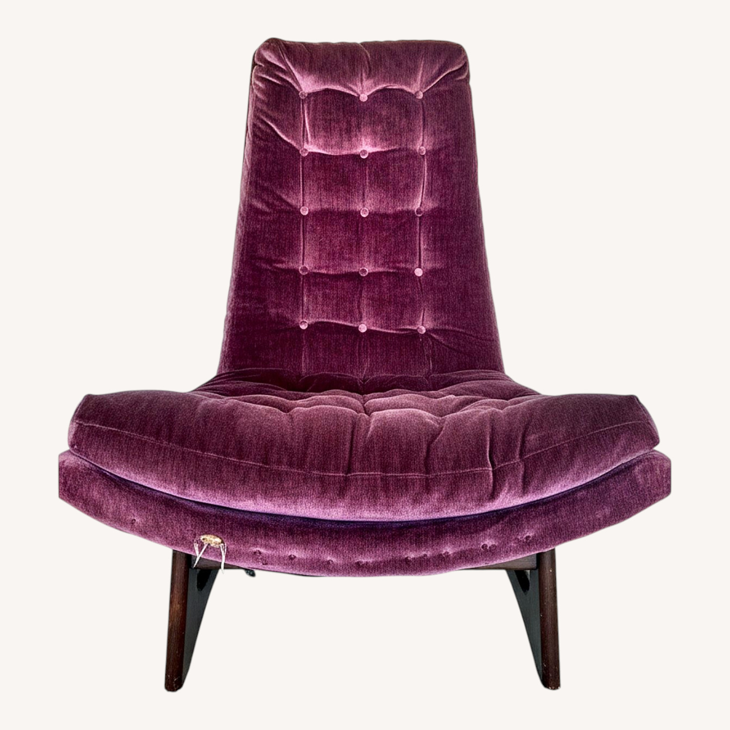 Seller's Notes:This plush purple tufted velvet high back tapered scoop sculptural slipper chair deserves a new loving home. It's giving vintage Atomic Age with its armless gondola-style and sled base (in the style of Adrian Pearsall). CONDITION: While technically usable and comfortable as is, the new owner should expect to fully re-upholster and refinish it. Please keep the price of those boutique services in mind before deciding to purchase. Chair has been exposed to a cat. Cat hair is difficult to get out of tufted velvet, but it has been thoroughly vacuumed and lint rollered. Anterior aspect of the seat has a large hole that is not only superficial and may have once anchored a strip of accent wood to the front. Fabric has some fading (though remarkably little given its age). Please see photos for other flaws including areas where edges are fraying, scratches / loss of stain on wood, and area where two pieces of wood are separating. All tuft buttons intact. Designer / Manufacturer not confirmed but similar chairs are attributed to Adrian Pearsall for Craft Associates. However the wood type and joinery type on this chair are different than Pearsall's style. Era: approximately 1960.
