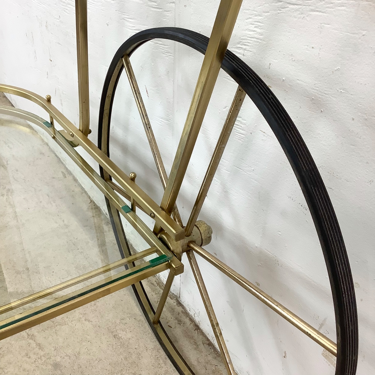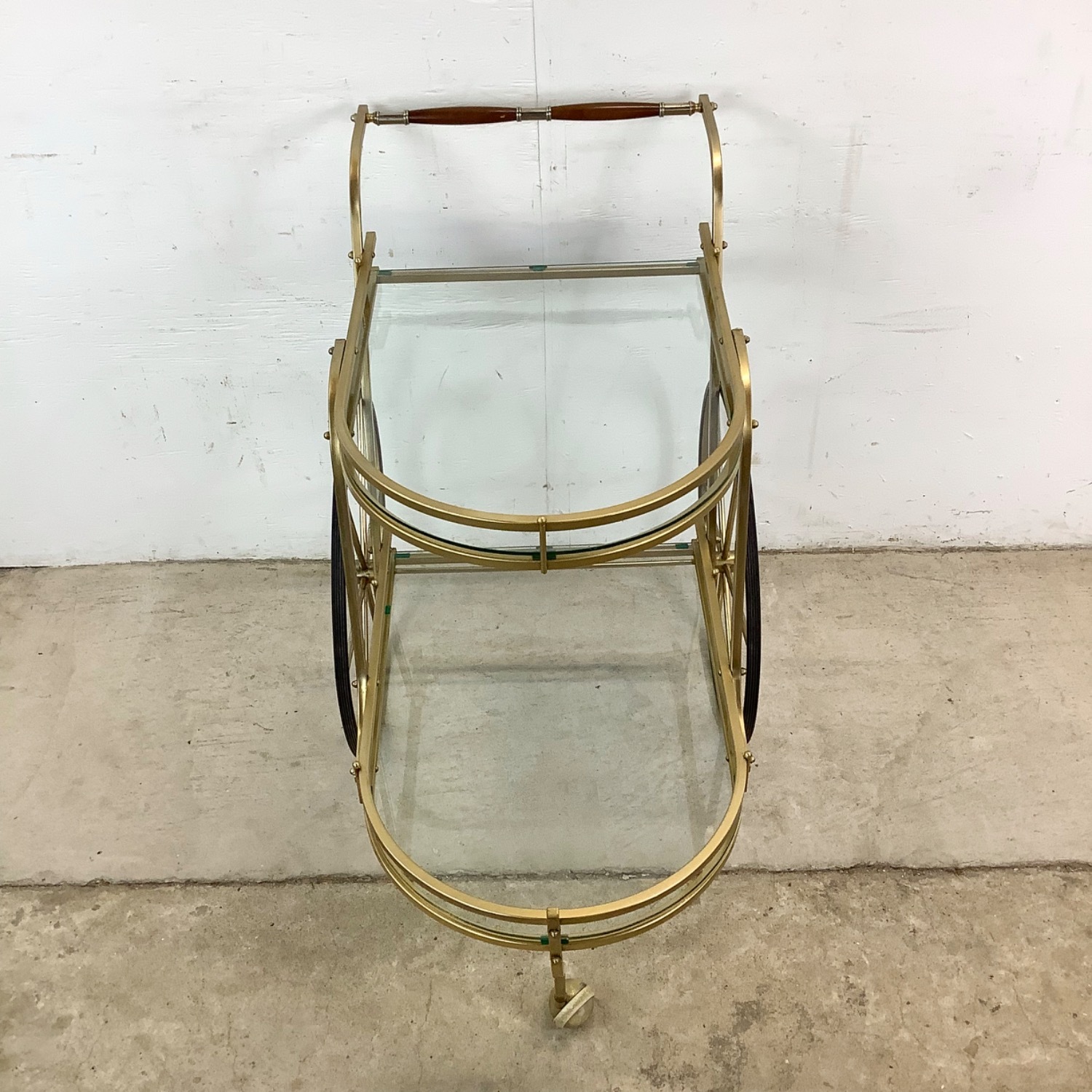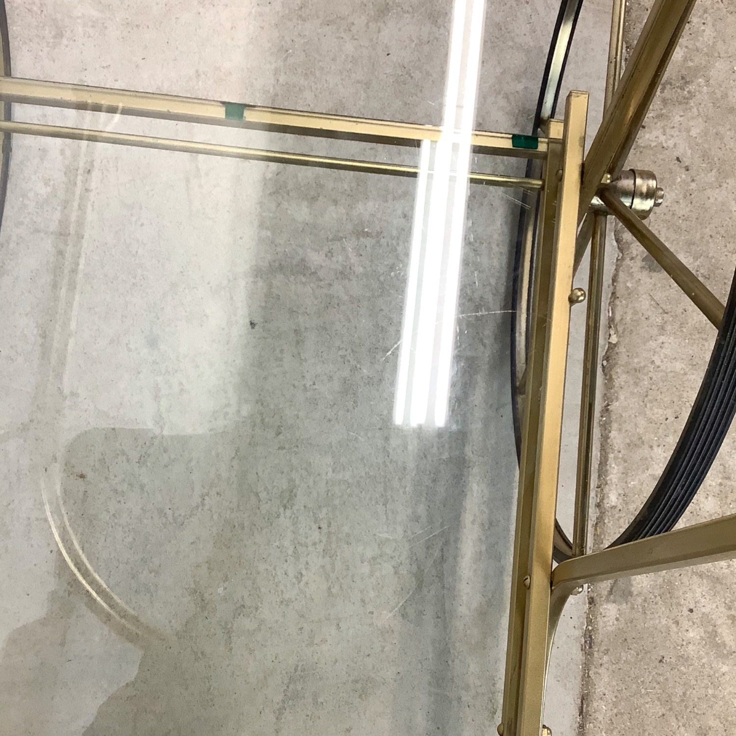 Seller's Notes:Step back in time with this vintage brass and glass bar cart, a true celebration of old-world elegance and practical design. Crafted with care during a bygone era, this trolley exudes charm while serving as an ideal entertaining accessory for any home. The polished glass shelves provide generous display space for your favorite spirits, tea service, or decorative accents. Their clarity and smooth surface lend a refined contrast to the warm, glowing brass frame that cradles them. Designed with both beauty and functionality in mind, this cart features wheeled casters that ensure effortless mobility. Whether you’re hosting an intimate tea party or setting up a cocktail station for a lively gathering, you can move this piece with ease from room to room. As a cherished vintage find, the brass finish bears subtle signs of wear—a natural patina that speaks to its history and adds an undeniable sense of authenticity. The aged accents do not detract from its beauty; rather, they enhance the narrative of a well-loved piece that has gracefully withstood the passage of time. Its versatile design means that it can be used not only as a bar cart but also as a tea trolley, a dessert station, or even a stylish display for books and collectibles. The timeless materials make it a harmonious fit with both classic and contemporary décor. Perfect for a variety of settings—from a formal dining room to a cozy living area—this cart provides both a functional surface and an eye-catching focal point. It’s a conversation starter that marries practicality with artistic appeal. For those who appreciate vintage luxury and enduring design, this brass and glass bar cart offers an exquisite blend of style and substance, ensuring that every gathering feels steeped in timeless sophistication. Dimensions: 22w 38d 32.75h 12.5h(bottom tier) 29h (top tier) Condition: age appropriate wear, vintage finish worn, scuffs/scratches, edge wear, discoloration, see photos.